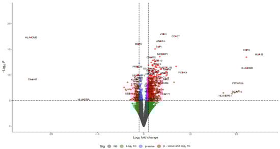 Differential expression between sepsis and control samples was determined by comparing gene expression levels in septic patients and healthy controls. Analysis was performed using DESeq239 with an adjusted p-value < 0.05 in R Studio. Upon mapping genomic reads from sepsis patients’ immune cells, including macrophages, neutrophils, and T cells, along with endothelial cells from heart and vascular tissues, heatmaps of differentially expressed genes demonstrated distinct clustering based on conditions (sepsis or control) and transcriptomic profiles. A volcano plot, depicted in Figure 4, allows for the visualization of expression changes and their significance throughout the complete gene set. Each gene is represented as a point in a two-dimensional space of statistical significance (p-value or FDR) versus log fold change.