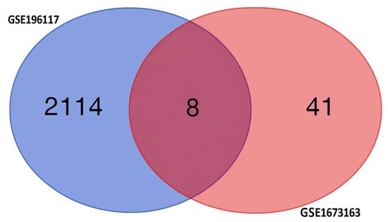 Volcano plots of the differential gene expression data from GSE196117. In the volcano plots, the red points show up-regulated genes (log2FC ≥ 0.5 and adjusted p-value < 0.05). The Venn map of the differentially expressed genes, however, shows the up-regulated genes as red dots.