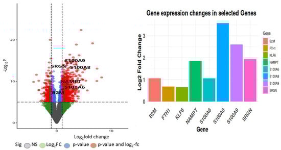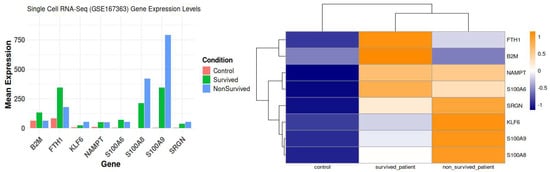 These differentially expressed genes (DEGs) exhibit unique functions across diverse immune cell types and disease outcomes, as indicated by their expression profiles and functional responsibilities. Figure 8 represent volcano plots of the genes that were differentially expressed in the two groups illustrate their distinct transcriptional profiles and nine-gene log fold value analysis revealed that up-regulated genes were involved in a sepsis. In healthy individuals, monocytes, T cells, and B cells demonstrate baseline immune surveillance, characterized by minimal ligand–receptor interactions. Genes like FTH1 regulate iron homeostasis to avert oxidative stress, B2M facilitates antigen processing and presentation, GAPDH propels glycolysis and metabolic processes, KLF6 modulates anti-inflammatory responses, and S100A6 enhances cellular stability and stress response. Dendritic cells in this cohort exhibit minimal immunological activation, with SRGN contributing to structural integrity and S100A8/S100A9 regulating baseline inflammation. In septic patients that survive, neutrophils and monocytes participate in augmented immune responses and tissue healing, supported by moderate ligand–receptor interactions. NAMPT facilitates energy generation via NAD+ synthesis, KLF6 regulates inflammation to aid recovery, and S100A8/S100A9 collaboratively enhance the immune response. In these individuals, NK cells and T cells demonstrate ligand–receptor interactions linked to immunological recovery, with GAPDH facilitating glycolysis, SRGN enhancing cell adhesion during tissue repair, and S100A6 supporting cellular recovery post-stress. In non-surviving septic patients, monocytes and macrophages exhibit hyperactivation of immunological responses, leading to cytokine storms and tissue destruction. Intense ligand–receptor interactions indicate significant immunological activation, with higher FTH1 levels to counteract oxidative stress, increased B2M for enhanced antigen presentation, and NAMPT promoting excessive metabolic demand, resulting in immune exhaustion. S100A8/S100A9 levels are significantly increased, exacerbating inflammation and cytokine signaling. Neutrophils and dendritic cells in this cohort demonstrate heightened ligand–receptor interactions, indicating immunological dysregulation. GAPDH facilitates metabolic requirements during stress, KLF6 is associated with tissue injury, SRGN promotes adhesion in inflamed tissues, and S100A6 acts as a biomarker for cellular stress in severe inflammatory states.