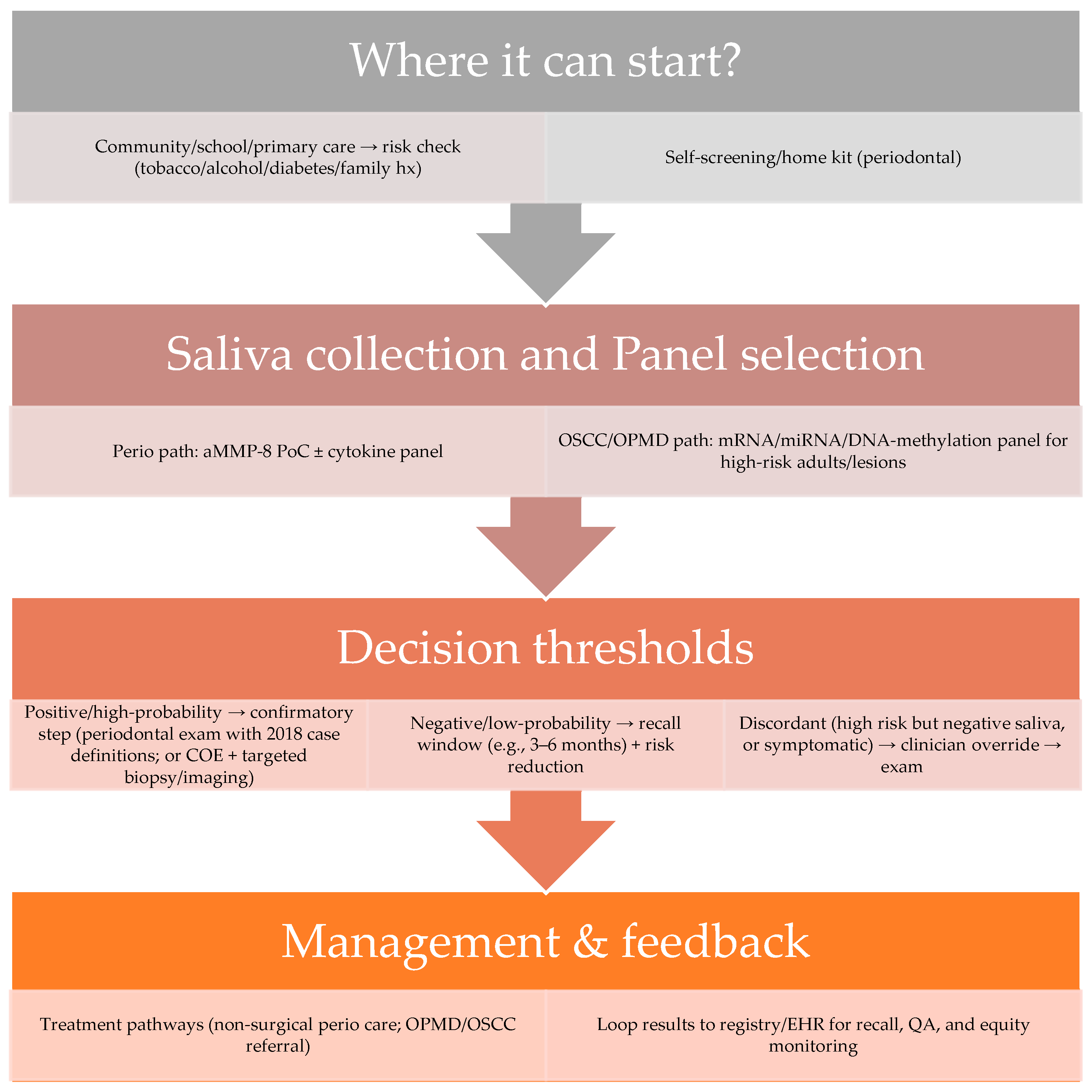 | Oral cancer (OSCC/HNSCC) | mRNA panels (saliva) | Saliva | High-risk clinic adjunct | Pooled Se 91%, Sp 90% [11]. | Promising, but heterogeneity and assay access limit field use. |