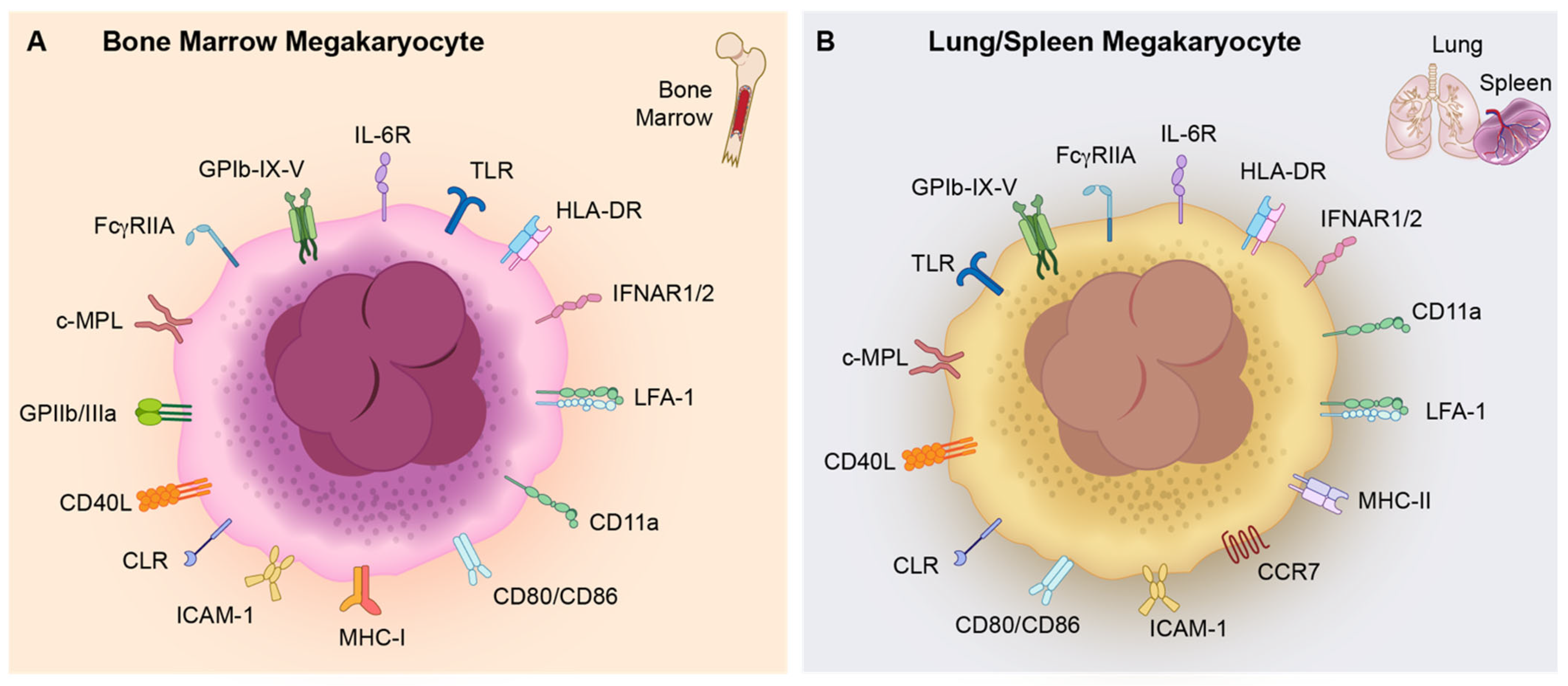 - Singh, S.V.; Lucerne, A.; Ravid, K. Immune and Inflammatory Properties of Megakaryocytes. Cells 2025, 14, 1053. [Google Scholar] [CrossRef] [PubMed]