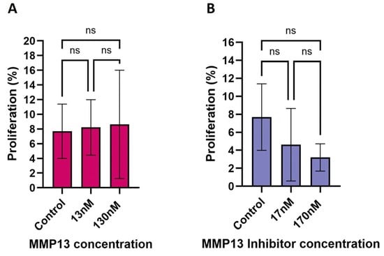 EdU assay showing the effect of recombinant MMP13 and MMP13-specific inhibition on the rate of keratocyte proliferation after 24 h of treatment. (A) Treatment with recombinant MMP13 (13 nM & 130 nM) had no significant (ns) effect on proliferation compared to untreated cells. (B) Treatment with the MMP13-specific inhibitor WAY170523 (17 nM & 170 nM) also had no significant effect on proliferation. Data are mean ± SD with a sample size (n) ranging from 7 to 12 per treatment.