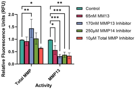 Treatment of cells with either an MMP13-specific inhibitor, an MMP14-specific inhibitor, or a broad-spectrum (total) MMP inhibitor significantly reduced the MMP13 activity compared to untreated (control) cells (p < 0.001, p < 0.001, p < 0.01, respectively (Figure 4). Interestingly, treatment of cells with 65 nM MMP13 also significantly reduced MMP13 activity in culture supernatants after 24 h (p < 0.05). We also assessed the total MMP activity in the same culture supernatants to determine if there would be an overall increase or decrease in total MMP activity with respect to treatment. As predicted, we observed a significant decrease in total MMP activity between untreated cells and cells treated with a broad-spectrum (total) MMP inhibitor (p < 0.05; Figure 4). Interestingly, we observed a significant increase in total MMP activity between untreated cells and cells treated with the MMP13-specific inhibitor WAY170523 (p < 0.01).