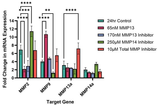 Quantitative PCR measuring the fold change in mRNA expression of MMP2, MMP9, MMP13a, and MMP14a following treatment with recombinant MMP13 or an MMP inhibitor for 24 h. Untreated cells were used as control. Bars represent mean ± SD with a sample size (n) of 3 per treatment. Key: ** denotes p < 0.01 and **** denotes p < 0.001.