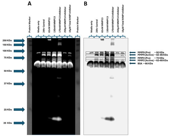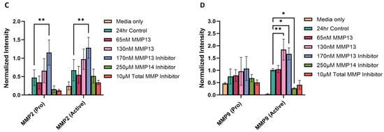 We assessed the gelatinase activity of MMPs using gelatin zymography by quantifying the clear bands in the stained gel, which represents degradation of gelatin. The bands, when aligned with the corresponding molecular weight marker, represent the presence of pro and active forms of MMP2 and MMP9 (Figure 6A,B). The zymogram results show that inhibition of MMP13 resulted in a significant increase in activity of MMP2 (p < 0.01; Figure 6C) and MMP9 (p < 0.05; Figure 6D), and the addition of 130 nM recombinant MMP13 resulted in a significant increase in only MMP9 activity (p < 0.01; Figure 6D) when compared to the untreated control. These results are consistent with our mRNA expression data (Figure 5). However, treatment with an MMP14-specific inhibitor caused a significant decrease in MMP9 activity (p < 0.05; Figure 6D) when compared to control, also consistent with MMP9 mRNA expression data (Figure 5). In contrast to the zymography data, we observed a significant decrease in MMP2 mRNA expression and a significant (p < 0.001) increase in MMP9 mRNA expression after treatment with an MMP13-specific inhibitor (Figure 5).
