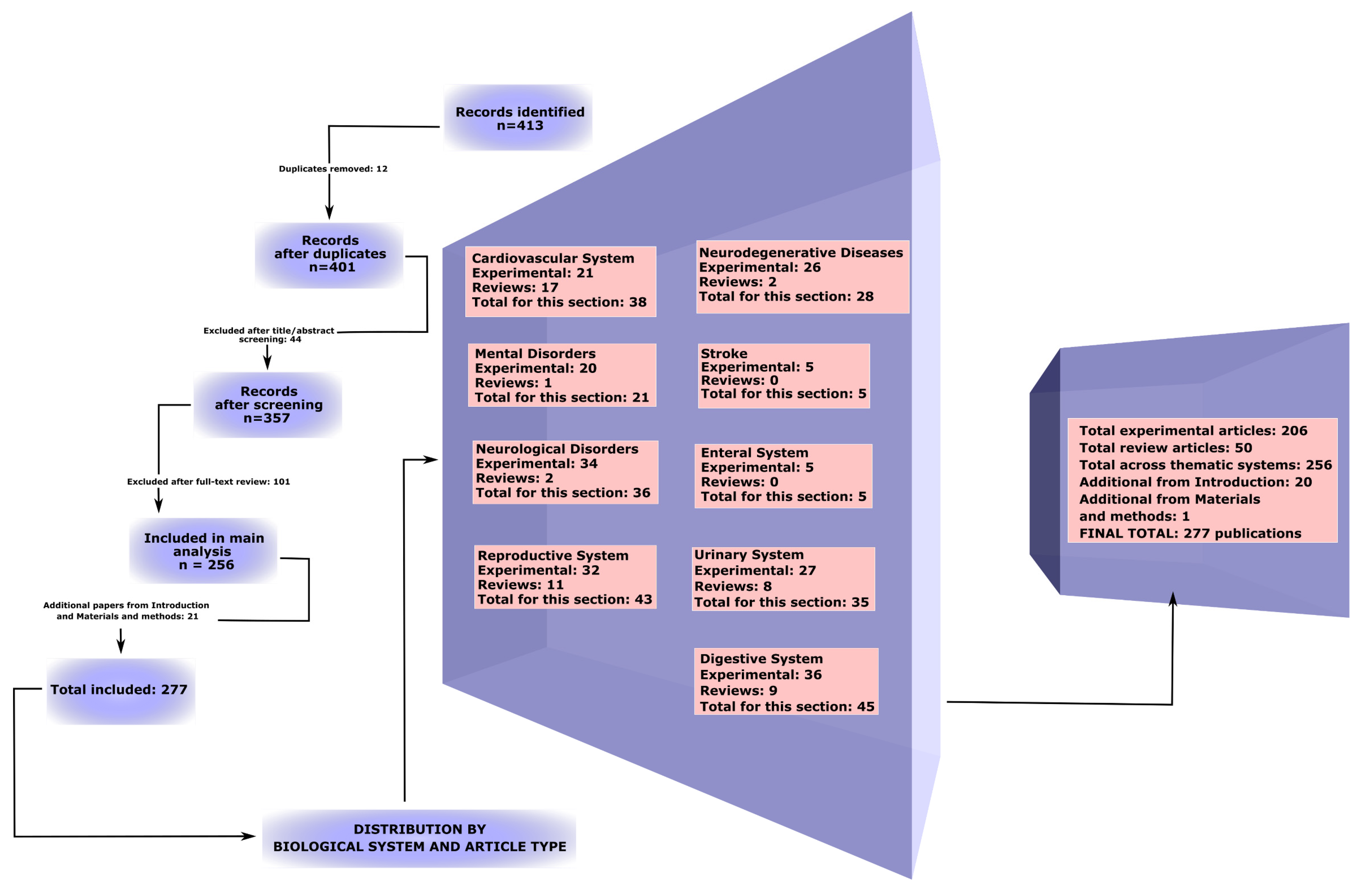 | Scopus | TITLE-ABS-KEY (“microplastic” OR “nanoplastic” OR “polymer particles”) AND TITLE-ABS-KEY (“cardiovascular system” OR “nervous system” OR “reproductive system” OR “urinary system” OR “gastrointestinal tract” OR “neurodegenerative diseases” OR “psychiatric disorders” OR “oxidative stress” OR “inflammation”) |