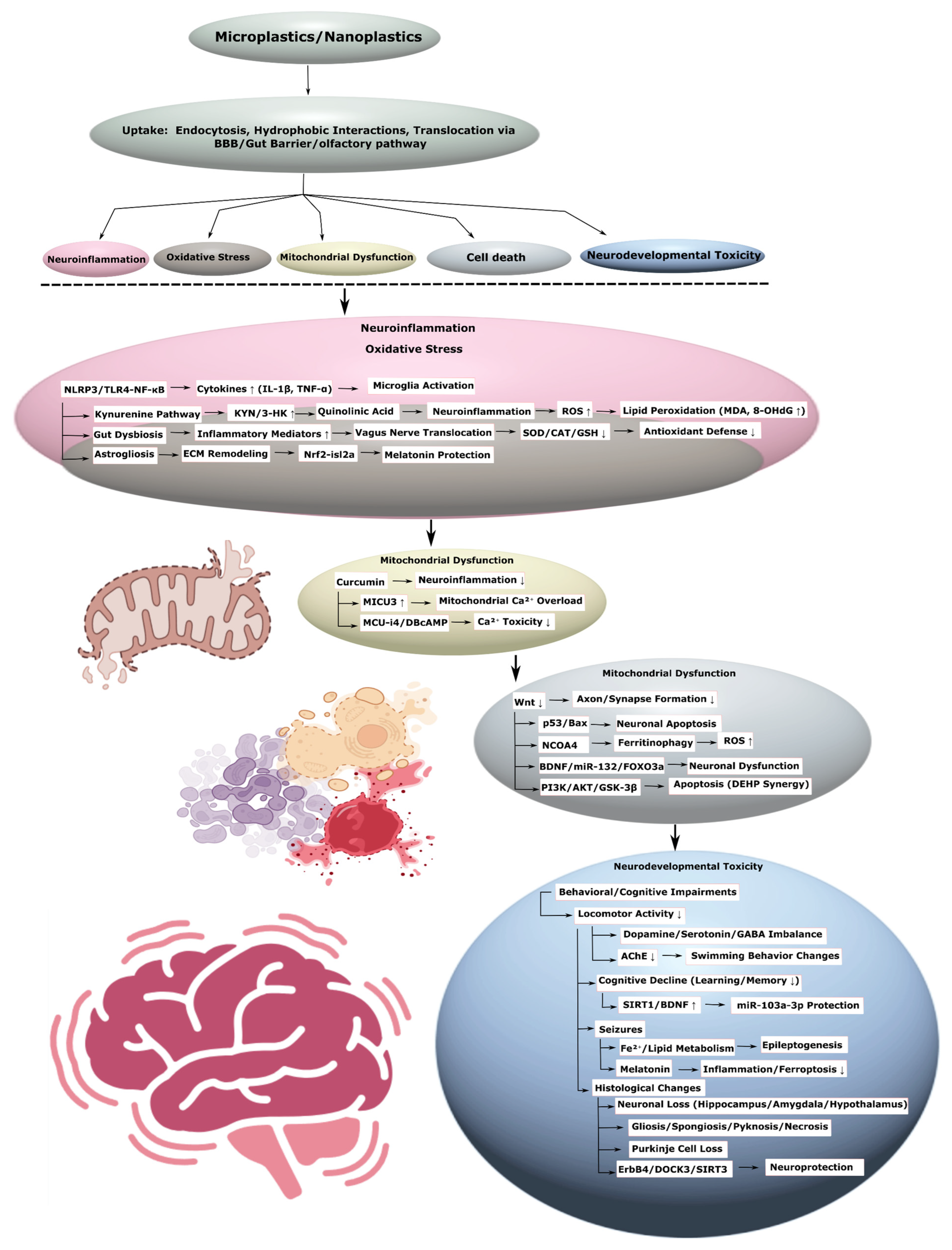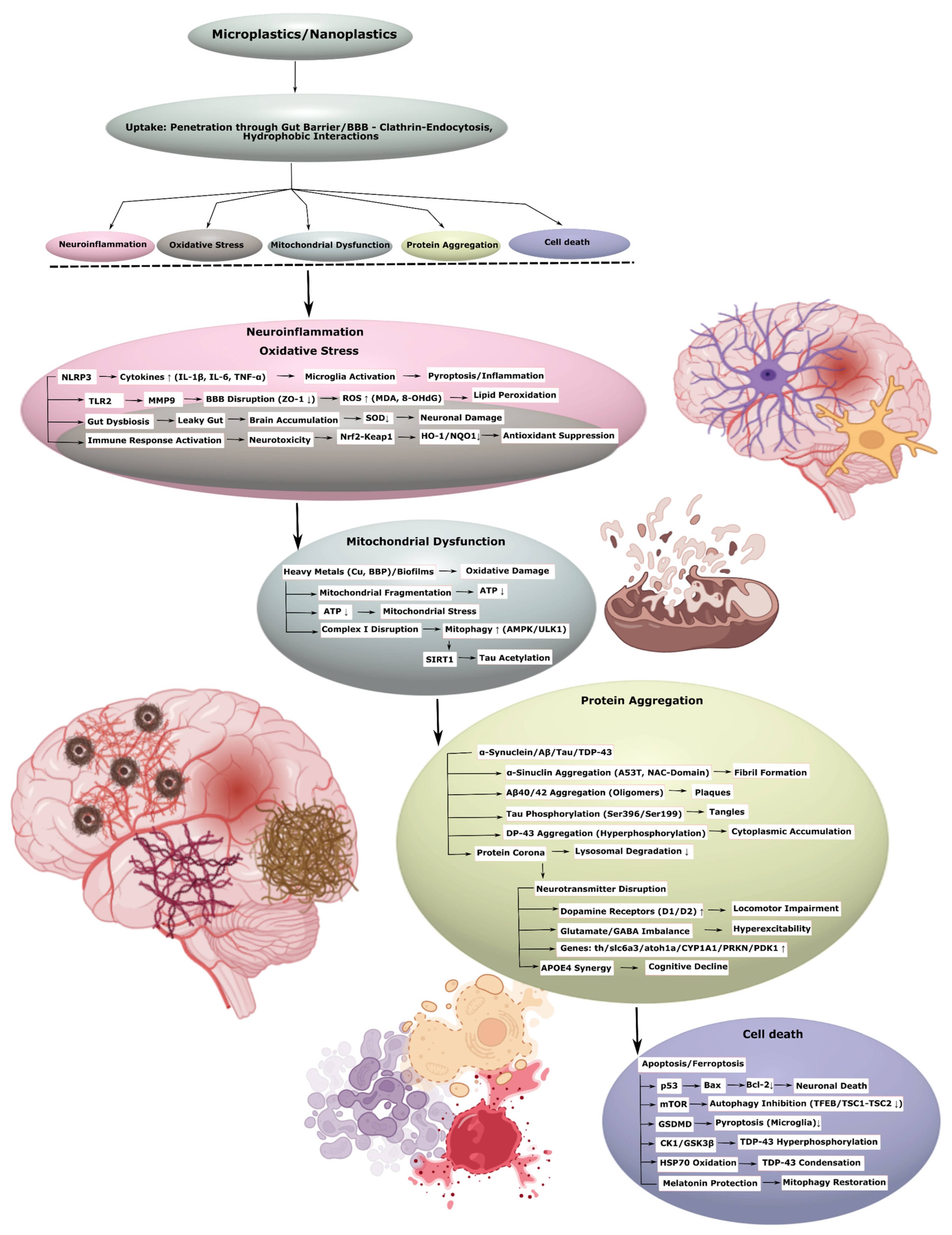 | 7. | Mice (in vivo, oral); in vitro MN9D | PS-NP, virgin | 10 mg/kg (1.5 h, in vivo); 7.5, 15, 30 mg/L (in vitro) | Autophagy inhibition (↑ mTOR, ↓ TFEB, TSC1-TSC2 degradation), pyroptosis activation, dopaminergic neuron death, cognitive deficits | [40] |
