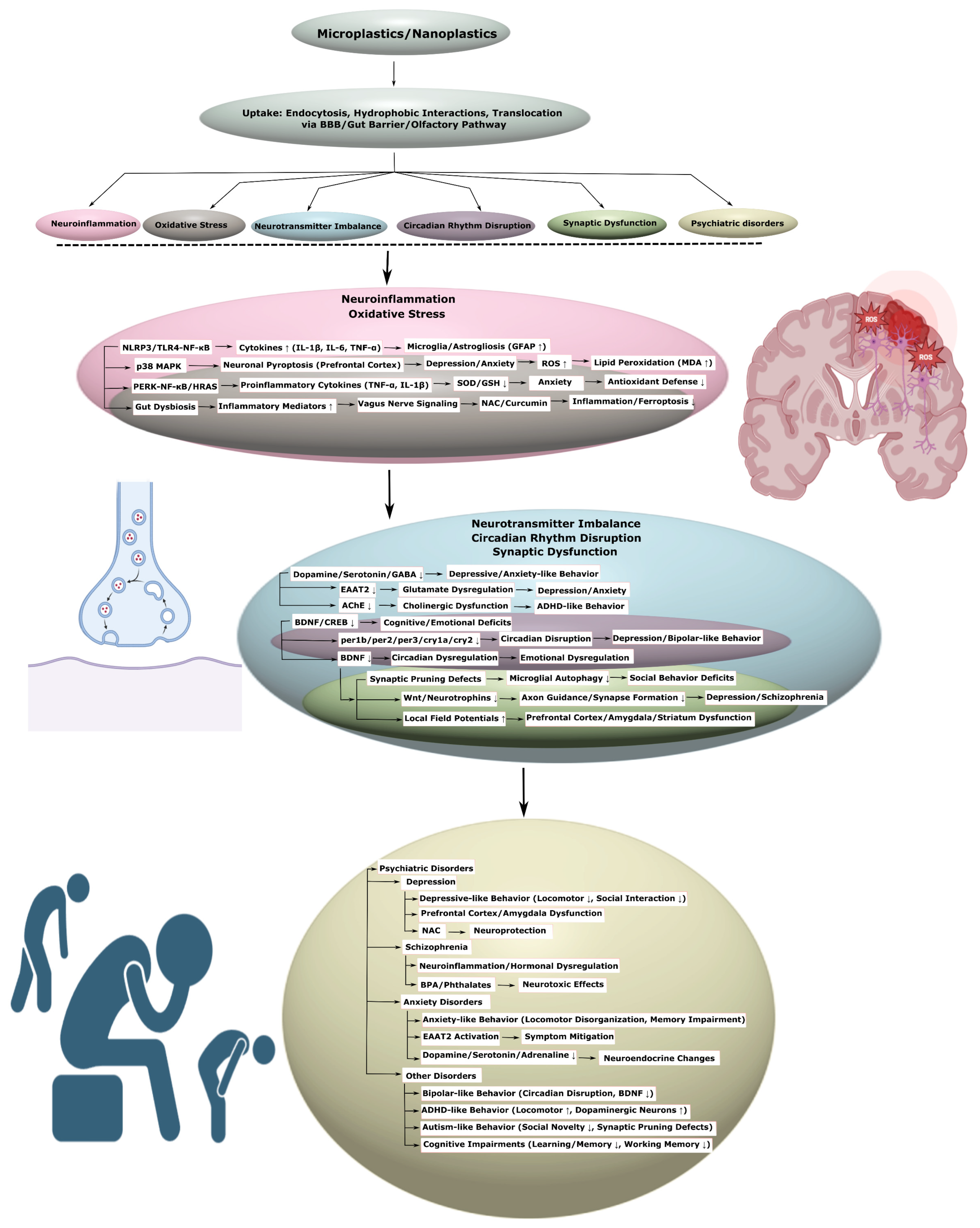 | 4. | Mice (prenatal, in vivo) | PS-NP, virgin | 100 nm/1 µm, 1 mg/day, oral, 17 days | Anxiety/depression in offspring; ↓ GABA in prefrontal cortex/amygdala; NAC restores | [48] |