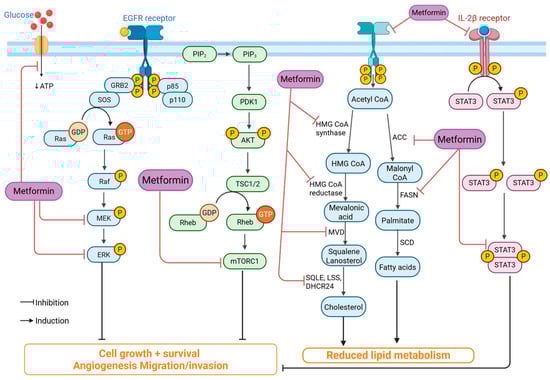 Mechanism of metformin’s anticancer activity. Metformin inhibits key oncogenic pathways, including EGFR/Ras/MEK/ERK, PI3K/AKT/mTOR, and IL-2β/STAT3, leading to reduced cell proliferation, angiogenesis, and invasion. It also suppresses lipid and cholesterol synthesis by downregulating enzymes such as HMG-CoA reductase, ACC, and FASN. Thereby limiting tumor growth and metastasis. (Image created in Biorender. VS Tshimweneka. (2025) https://app.biorender.com/illustrations/682eb8d751f88b68ee1c2363?slideId=43839ab2-b059-4c64-ac64-4d1a654419ce).
