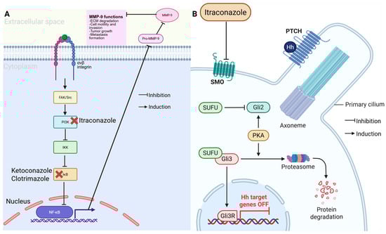 Anticancer mechanism of azole antifungals. (A) Itraconazole inhibits the PI3K/NF-κB pathway, reducing MMP-9 activity and limiting cell invasion and metastasis. Ketoconazole and clotrimazole similarly block IκB activation. (B) Itraconazole also suppress Hedgehog (Hh) signaling by inhibiting SMO, preventing GLI activation and turning off Hh target genes, thereby reducing tumor growth. (Image created in Biorender. VS Tshimweneka. (2025) https://app.biorender.com/illustrations/682eb8d751f88b68ee1c2363?slideId=43839ab2-b059-4c64-ac64-4d1a654419ce.)
