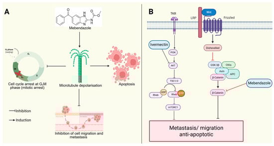 Anticancer activity of mebendazole and ivermectin. (A) Mebendazole induces microtubule depolarization, causing G2/M phase arrest, which stops the cell cycle from progressing to the next phase (shown by the red cross), triggers apoptosis, and inhibits cell migration and metastasis. (B) Mebendazole also blocks the Wnt/β-catenin signaling, while ivermectin inhibits the PI3K/AKT/mTOR pathway and together they reduce metastasis and promote apoptosis. (Image created in Biorender. VS Tshimweneka. (2025) https://app.biorender.com/illustrations/682eb8d751f88b68ee1c2363?slideId=43839ab2-b059-4c64-ac64-4d1a654419ce).