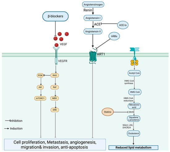 β-Blockers exert anticancer effects by inhibiting β-adrenergic signaling, which is implicated in TNBC progression by promoting proliferation, metastasis, and angiogenesis []. Propranolol, a non-selective β-blocker, has been shown to reduce TNBC cell proliferation, migration, and invasion in vitro, while in vivo studies have demonstrated the inhibition of tumor growth and metastasis [,]. The mechanism involves the modulation of PI3K/AKT and MAPK signaling pathways, suppression of vascular endothelial growth factor (VEGF) expression (Figure 6), and enhanced immune response through the restoration of natural killer cell activity []. Similarly, ACE-Is and ARBs have been investigated for their ability to modulate the tumor microenvironment. This is achieved by inhibiting the renin–angiotensin system (RAS). These drugs can downregulate VEGF, MMPs, and pro-inflammatory cytokines, leading to reduced angiogenesis, tumor growth, and metastasis [].