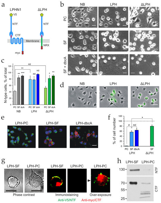 A key feature of NB cells is their ability to differentiate upon serum reduction and cAMP elevation and develop strong neuronal characteristics [27,42,48,49]. To elucidate how the expression of the receptor constructs and cell differentiation affected the cells, we quantified the number of N-type cells and the number and length of neurites. The three cell lines were treated with a serum-free (SF) medium alone or with the addition of dibutyryl cyclicAMP (dbcAMP) (Figure 1b). Proliferating NB cells (NB-PC) and ΔLPH cells (ΔLPH-PC) contained a roughly equal mixture of S- and N-type cells, whereas proliferating LPH cells (LPH-PC) were predominantly of the N-type (80% in LPH-PC vs. 41% in NB-PC, p < 0.007; vs. 52% in ΔLPH-PC, p = 0.037) (Figure 1b, top row; 1c). Serum-deprivation significantly increased the proportion of N-type cells in SF-differentiated cultures (83% in NB-SF vs. 41% in NB-PC, p < 0.0001, and 84% in ΔLPH-SF vs. 52% in ΔLPH-PC, p < 0.009) but did not further increase the number of N-type cells in SF-differentiated LPH cultures (79% in LPH-SF vs. 80% in LPH-PC) (Figure 1b, middle row; 1c). The addition of dbcAMP to SF medium increased the population of N-type cells insignificantly in NB and ΔLPH cells only (91% in NB-dbcA vs. 41% in NB-PC, p < 0.0001; 96% LPH-dbcA vs. 80% in LPH-PC, p = 0.15; 84% in ΔLPH-dbcA vs. 52% in ΔLPH-PC, p 0.002) (Figure 1b, bottom; 1c).
