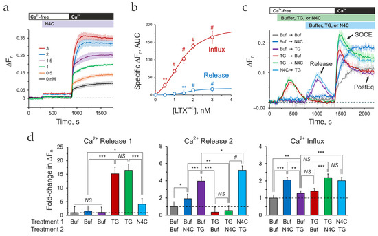 LTXN4C induces an increase in [Ca2+]cyt via LPHN1 but does not involve the TG-sensitive Ca2+ stores. LPH-SF cells were loaded with the Ca2+-sensing dye Fluo-4 AM and recorded in a multi-well fluorescent plate reader, and stimulated as shown above the traces (a,c). The dye-loading protocol, applicable to all experiments with Fluo-4, is described in detail in Section 4.7.1. Initial incubation in a nominally Ca2+-free medium was followed by the addition of LTXN4C or TG, and subsequent addition of 2 mM Ca2+. (a) Dose dependence of changes in Ca2+cyt fluorescence induced by 0–3 nM LTXN4C. (b) Quantification of the data in (a) after subtracting the basal Ca2+ fluorescence. LTXN4C causes a small increase in Ca2+cyt in the Ca2+-free buffer and a large Ca2+e influx after Ca2+ addition. Both effects are LTXN4C dose-dependent. (c) LTXN4C and TG induce Ca2+ release and influx by acting through different mechanisms. Normalized Ca2+ fluorescence changes triggered by 1 nM LTXN4C before or after treatment with 0.3 μM TG in the absence and then presence of Ca2+e. Buf, buffer (no stimulus). The main phases of TG action are also indicated by arrows: Ca2+ release, SOCE peak, and post-SOCE Ca2+cyt equilibrium (PostEq). (d) Specific (above basal) fold-changes in Ca2+ fluorescence induced by LTXN4C or TG during Treatments 1 and 2 in the Ca2+-free medium (Release 1 and Release 2), and after re-addition of Ca2+ (Influx). For illustration, ΔFn values were aggregated over time for each phase as AUCs and normalized to ΔFn in unstimulated cells (Buf → Buf). The dashed lines show the basal level (fold-change 1). (a–d) The data are the means of n = 3–5 experiments ± SE (a,b) or SD (d,c). Asterisks show statistical significance of the differences between indicated conditions, tested using FANOVA (b) or one-way ANOVA (d); *, p < 0.05; **, p < 0.01; ***, p < 0.001; #, p < 0.0001; NS, non-significant.