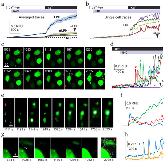 Changes in Ca2+cyt levels in individual NB, LPH, and ΔLPH cells upon stimulation with LTXN4C. The cells were loaded with the Ca2+ sensing dye Fluo-4 AM, recorded under a confocal microscope, and stimulated as indicated by bars at the top. (a,b) The cells were incubated in a Ca2+-free medium, when the background fluorescence F0 was recorded. The cells were then stimulated with 2 nM LTXN4C, supplied with 2 mM Ca2+e, and finally permeabilized with 2 nM αLTX to record the maximal Ca2+ fluorescence Fmax (arrowheads). All data were normalized to F0 and Fmax, as described in Section 4.7.2. (a) Average traces ± SE from 22 to 26 individual NB, LPH and ΔLPH cells. RFU, normalized relative fluorescence units. (b) Individual fluorescence traces ± SE from randomly selected LPH cells. The data are representative of n = 4 independent experiments with 20–30 individual cells recorded in each (N = 80–120). (c–h) The LPH cells were incubated in the presence of 2 mM Ca2+e, stimulated with 2.5 nM LTXN4C, and permeabilized with 2.5 nM αLTX (arrowhead). (c) Selected time-lapse fluorescent images of a group of cells (1–4). The numbers indicate the time in seconds from the beginning of recording; the scale bar is 20 μm. (d) Fluorescence intensity profiles of individual cells and varicosities from (c). LTXN4C, Ca2+, and αLTX additions are shown by arrowheads. The colored numbers indicate corresponding cells or varicosities in (c). Note that the undifferentiated cell 4 did not respond to either toxin. (e) Selected fluorescent images of neurite 6 from (c) containing varicosities (1–3), which independently respond to LTXN4C stimulation. The scale bar is 2 μm. (f) Relative fluorescence within the individual varicosities from (e). (g) Selected fluorescent images of a varicosity (V) physically and functionally linked to cell 3 from (c). The scale bar is 4 μm; the arrow in image 2 in panel (g) indicates a Ca2+ transient in a neurite connecting the varicosity and cell; the last image in series (g) shows the same neurite traced after permeabilization with αLTX. (h) Respective relative fluorescence intensity profiles. Note that the Ca2+ signal in the varicosity precedes the signal within the cell. The experiment is a representative of n = 9 independent experiments, with 4–25 individual cells recorded (N = 36–160), which showed similar results.