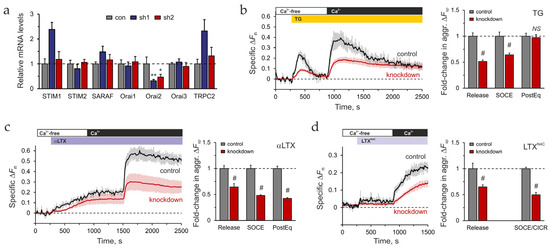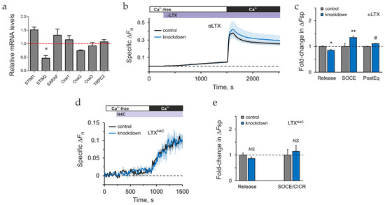 The inhibition of STIM2 mRNA in transduced LPH cells was ascertained by qRT-PCR and constituted ~65% (Figure 6a), while other SOCE-associated proteins were not significantly affected. We then assessed the effect of STIM2 knockdown on Ca2+ signaling in cells loaded with Fluo-4 AM and stimulated with αLTX or LTXN4C (Figure S6c–e and Figure 6b–e). Under basal conditions (no stimulation), Ca2+ release during incubation in Ca2+-free medium was slightly but insignificantly lower in knockdown cells compared to control LPH cells (Figure S6c,d). By contrast, Ca2+ influx was increased by ~28% in STIM2 knockdown LPH cells (Figure S6c,d).