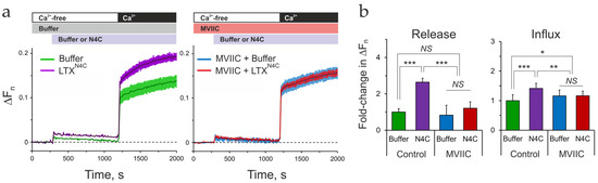 ω-Conotoxin MVIIC blocks LTXN4C-induced LPHN1-mediated SOCE/CICR. LPH-SF cells were incubated in Ca2+-free medium, exposed to 5 μM MVIIC or buffer (Control), then stimulated by 1 nM LTXN4C or treated with buffer, and finally supplied with 2 mM Ca2+e, as shown by bar above. (a) Changes in Ca2+ fluorescence under basal conditions or induced by LTXN4C in the absence (left) or presence (right) of MVIIC. The dashed lines represent zero. (b) Fold-changes in Ca2+ release (left) and Ca2+ influx (right) relative to buffer in the absence (Control) or presence of MIIC. The data are the means ± SE of n = 4 experiments (N = 12). Asterisks indicate the significance of differences (tested by FANOVA) between the connected values: *, p < 0.05; **, p < 0.01; ***, p < 0.001; NS, nonsignificant.
