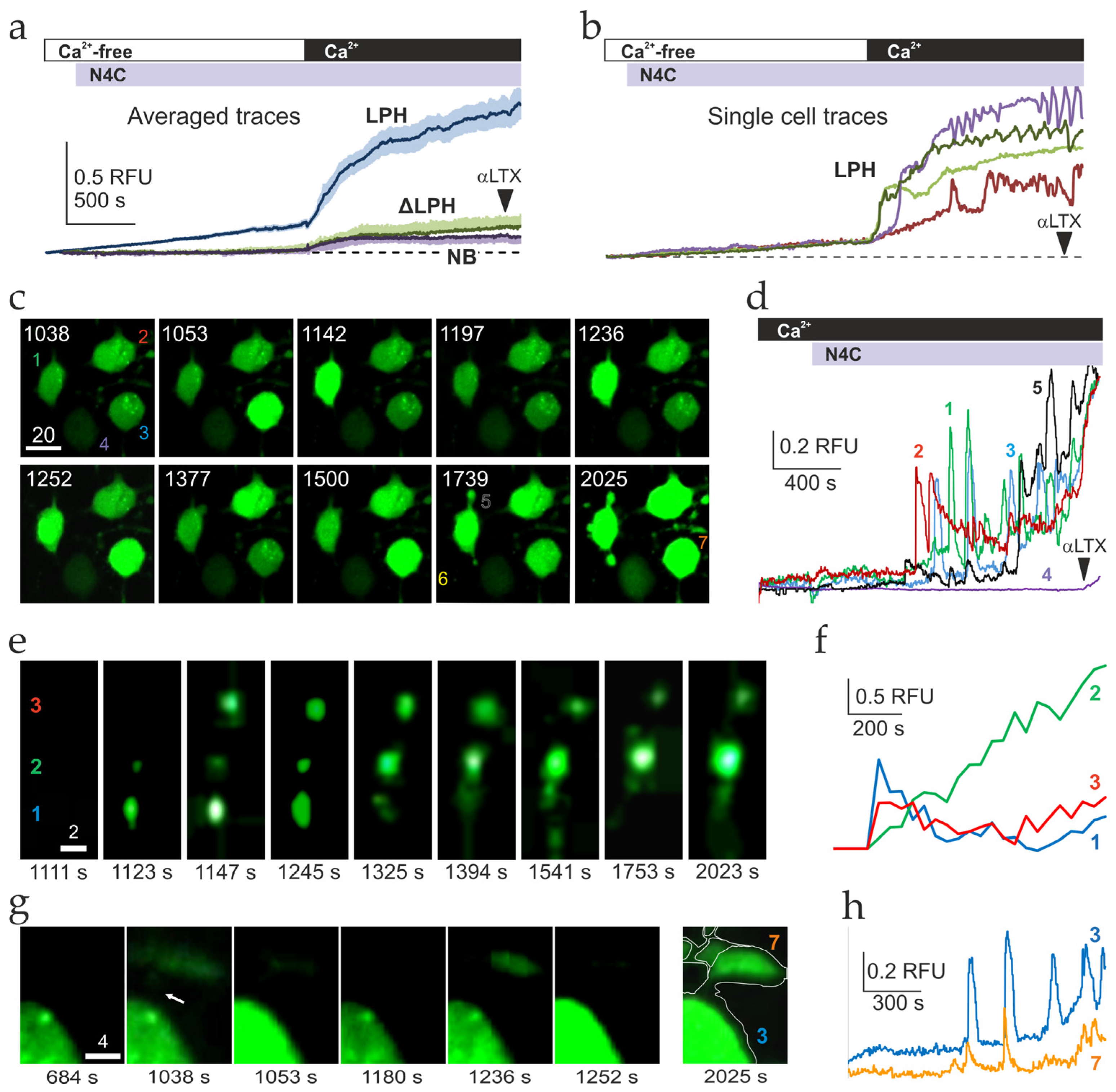 2.2. LPHN1 Activation by LTXN4C Elevates Ca2+cyt in the Presence of Ca2+e