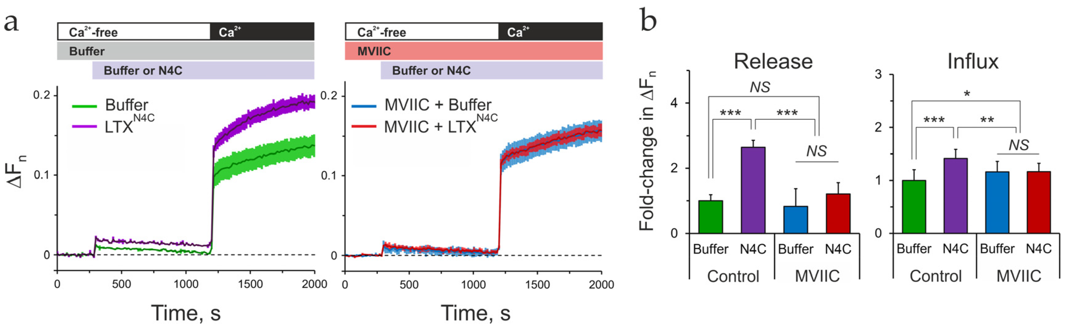 The Mechanism of LTXN4C-Induced Ca2+ Influx Involves Latrophilin-Mediated Activation of Cav2.x Channels