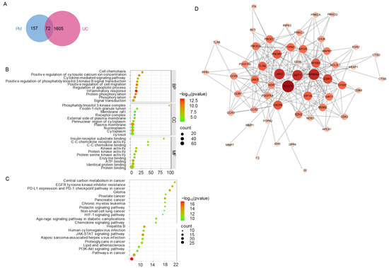 Network construction and analysis of PM for alleviating UC. (A) Venn diagram of PM and UC targets. (B) GO and (C) KEGG enrichment analysis, and (D) PPI (Protein-Protein interaction) network of common targets. The shade of color represents the number of interacting protein molecules. PM: peimine. UC: ulcerative colitis.