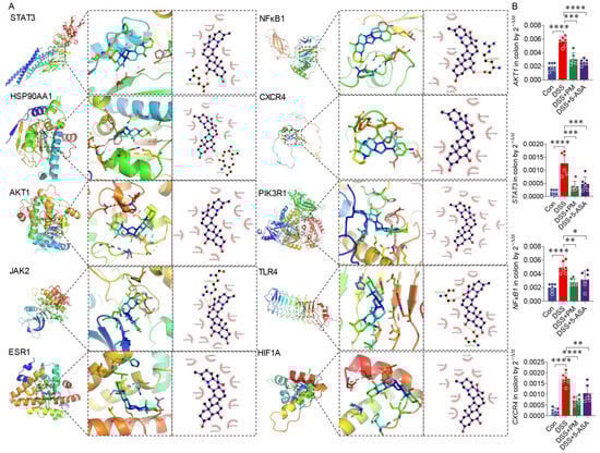 Docking simulation results of peimine (PM) and key targets. (A) STAT3, HSP90AA1, AKT1, JAK2, ESR1, NFκB1, CXCR4, PIK3R1, TLR4, and HIF1A. (B) Gene expressions of AKT1, STAT3, NFκB1, and CXCR4 in the colon by qPCR. * p ≤ 0.05, ** p ≤ 0.01, *** p ≤ 0.001, and **** p ≤ 0.0001 indicate significant differences between different groups.