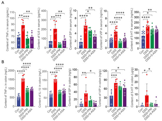 Oral PM attenuated DSS-induced inflammation. TNF-α, IL6, SP, VIP and 5-HT in the (A) serum and (B) colon. * p ≤ 0.05, ** p ≤ 0.01, *** p ≤ 0.001, and **** p ≤ 0.0001 indicate significant differences between different groups.