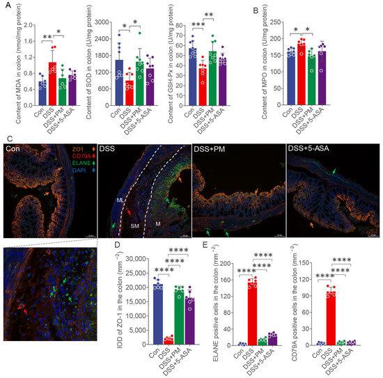 Oral PM attenuated oxidative stress and enhanced mucosa integrity. (A) Concentrations of SOD, GSH-Px, and MDA in the colon. (B) Content of MPO in the colon. (C) Expressions of ZO-1 (orange), CD79A (red), ELANE (green), and DAPI (blue) in the colon. Scale bar = 100 μm. (D) IOD of ZO-1 in each group. (E) The numbers of CD79A- and ELANE-positive cells in each group. * p ≤ 0.05, ** p ≤ 0.01, *** p ≤ 0.001, and **** p ≤ 0.0001 indicate significant differences between different groups. IOD: integral optical density.