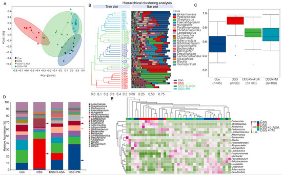 To determine whether peimine (PM) modulates gut microbiota dysbiosis in colitis, we performed 16S rRNA sequencing on fecal samples from DSS-treated mice administered PM or 5-ASA. Beta diversity analysis (PCoA) revealed significant structural segregation between healthy controls and DSS-induced colitis mice (PERMANOVA, p < 0.05; Figure 6A). Notably, both PM and 5-ASA restored microbial community structure, clustering closely with healthy controls (Figure 6B). Alpha diversity metrics (Chao1, Shannon, Pielou’s evenness) confirmed reduced richness and diversity in colitis, which PM significantly rescued (Figure 6C and Figure S3A).