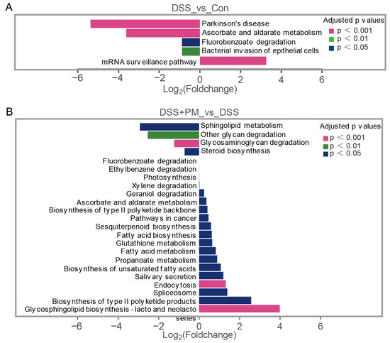 Enriched KEGG pathways from the composition of fecal bacteria according to functional genes. The differentially enriched pathways between (A) control and DSS group, and (B) between DSS and DSS + PM group.