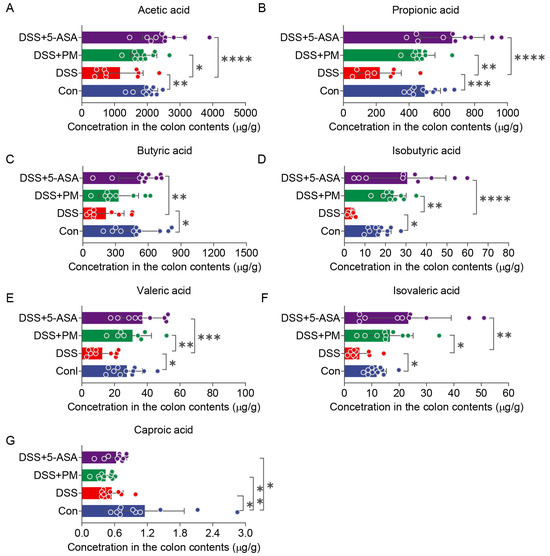 To investigate the impact of peimine (PM) on microbial metabolic output, we quantified fecal concentrations of seven short-chain fatty acids (SCFAs): acetic, propionic, butyric, isobutyric, valeric, isovaleric, and caproic acids. DSS administration significantly reduced levels of acetic acid and propionic acid compared to controls. Notably, both PM and 5-ASA treatment restored their production to near-normal levels (Figure 8A,B). Similarly, DSS-induced depletion of butyric, valeric, isobutyric, and isovaleric acids was significantly reversed by PM and 5-ASA supplementation (Figure 8C–F). In contrast, while caproic acid levels were also suppressed in the DSS group, neither PM nor 5-ASA restored its production (Figure 8G).