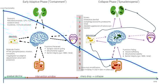 The Path to Synucleinopenia and Ecosystem Collapse. The early adaptive phase shows preserved α-syn functionality despite increasing stressors (microbial amyloids, toxins, oxidative stress). Molecular events, including post-translational modifications and adaptive aggregation, initially provide short-term protection. At the tipping point, clearance mechanisms fail, leading to the collapse phase characterized by synucleinopenia—functional α-syn depletion below critical thresholds. Cross-axis amplification then propagates dysfunction from initial sites (illustrative examples shown: gut, kidney, oral, skin) to other organ–brain axes, culminating in irreversible systemic failure. The intervention window represents the critical period preceding the tipping point, during which ecosystem restoration remains feasible. Arrow legend: Blue curve: α-syn functionality over time (gradual decline → tipping point → sharp collapse); Dashed black arrows: Stressor inputs into the CNS during the adaptive phase; Solid black arrows: Cross-axis amplification pathways transmitting dysfunction between organ-organ systems; Dashed purple arrows: Bidirectional prion-like propagation of misfolded species between organs and brain; Solid purple arrows: Reinforcement loops that maintain collapse once synucleinopenia is established; Dark green arrow (baseline): Gradual decline trajectory; Red arrow (baseline): Intervention window, where therapeutic reversal is possible. Light Green arrow (baseline): collapse—synucleinopenia phase.