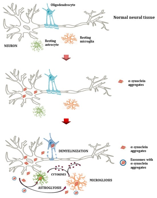 Normal neural tissue (upper plot) illustrates healthy interactions among neurons, oligodendrocytes, astrocytes, and microglia. Aggregates of α-syn form through the induced expression of the α-syn gene (SCNA) by various cells and/or the ineffective glial clearance mechanism (middle plot). Microglia and astrocytes phagocytize and accumulate misfolded α-syn. This results in oligodendrocyte degeneration, the loss of trophic support to neurons, and demyelination (lower plot). Extracellular α-syn aggregates cause astrocytosis and microgliosis, as well as the release of pro-inflammatory cytokines and reactive oxygen species, creating a neuroinflammatory milieu that further impairs neuronal integrity in PSDs. Microglia appear to have a dual role that involves the removal of α-syn and the production of cytokines.
