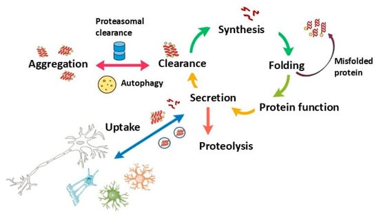 Protein Homeostasis Cycle: This schematic represents the cyclical processes involved in protein synthesis, folding, function, secretion, and clearance. Dysregulation at any point, particularly in folding, aggregation, or clearance, can lead to protein misfolding and aggregation, contributing to neurodegenerative processes. Uptake by surrounding cells highlights the potential for intercellular spread of misfolded proteins, a feature relevant in diseases such as MSA and PD, where protein aggregation and propagation exacerbate cellular dysfunction.