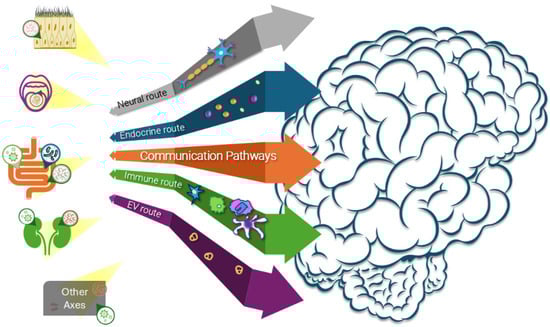 Mounting evidence now shows that neurodegeneration begins outside the CNS, often years before motor or cognitive symptoms emerge [7,8,9]. Constipation, orthostatic hypotension, REM sleep behavior disorder, reduced renal clearance, and periodontal disease can precede Parkinson’s disease (PD) motor onset by decades. Similarly, gut dysbiosis, viral reactivation, systemic inflammation, and metabolic stress have been implicated as early triggers in AD and ALS [10]. These observations suggest the existence of interconnected organ–brain axes whose continuous, bidirectional communication sustains protein homeostasis, immune balance, barrier integrity, and mitochondrial health. When these axes fail, pathology is no longer contained locally but propagates bidirectionally via neural tracts (e.g., the vagus nerve), endocrine mediators, immune signals, and extracellular vesicles (EVs) [11].