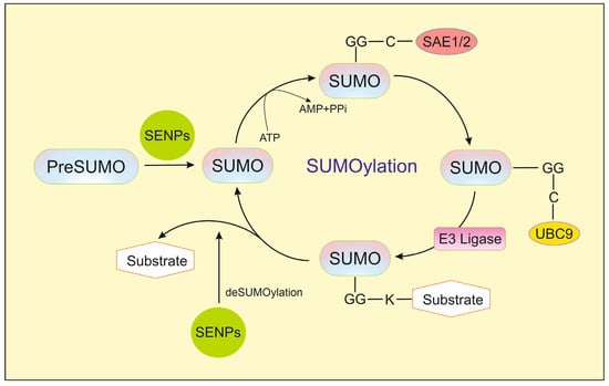 Sumoylation, one of the post-translational modifications of proteins, is a reversible process of attaching SUMO (small ubiquitin-like modifier) proteins, approximately 11 kDa in size, to target proteins. It affects, among other things, the regulation of DNA repair, immune response, the progression of the cell cycle, and apoptosis. Post-translational modifications of proteins can alter their conformation, hydrophobicity, charge, or stability, thereby affecting the functions they perform [1,2]. Four isoforms of the SUMO protein (SUMO-1–4) are present in mammals, and all show a high degree of similarity. Due to the approximately 97% homology between the SUMO-2 and SUMO-3 proteins, they are often referred to as the SUMO-2/3 protein. The SUMO-4 protein has another amino acid, proline (Pro), in the place where Gln90 is present in other SUMO proteins. This change in the structure of SUMO-4 prevents the SENP from accessing the appropriate areas of the protein precursor, and consequently, it is unable to produce its mature form [3]. Additionally, SUMO-1–3 proteins are found in all human tissues, whereas SUMO-4 mRNA has been localized to the kidney, lymph nodes, and spleen [1].
