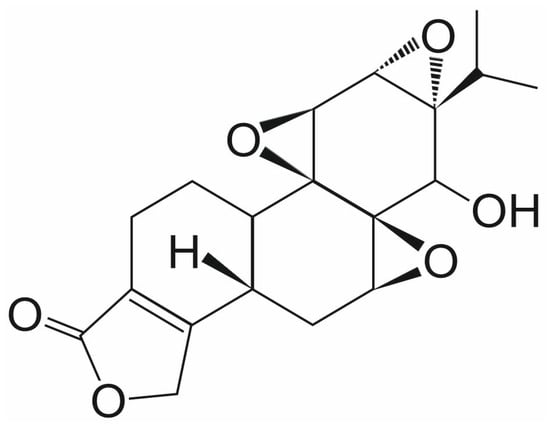 Triptolide (TPL) is a natural diterpenoid epoxide that is extracted from the Chinese herb Tripterygium wilfordii (Figure 4). TPL exhibits anticancer activity against many human cancers, including prostate cancer, leukemia, and glioma [44,45,46]. In the NCI-60 screen, TPL demonstrated activity against all lines, with IC50 values ranging from 2.6 to 103 nM [47]. Based on the recent preclinical investigations, TPL is linked to the induction of death of cancer cells by triggering cellular apoptosis via inhibiting heat shock protein expression (HSP70) and cyclin-dependent kinase (CDK) by upregulating the expression of P21. MKP1, histone methyltransferases, and RNA polymerases have all recently been identified as potential targets of TPL in cells. Autophagy, AKT signaling pathway, and various pathways involving targeted proteins such as A-disintegrin and metalloprotease-10 (ADAM10), Polycystin-2 (PC-2), dCTP pyro-phosphatase 1 (DCTP1), peroxiredoxin-I (Prx-I), TAK1 binding protein (TAB1), kinase subunit (DNA-PKcs), and the xeroderma-pigmentosum B (XPB or ERCC3) have been exploited [48]. Moreover, TPL is responsible for enhancing the effectiveness of various chemotherapeutics, including cisplatin, carboplatin, PI3K inhibitors, and anthracyclines [49,50,51].
