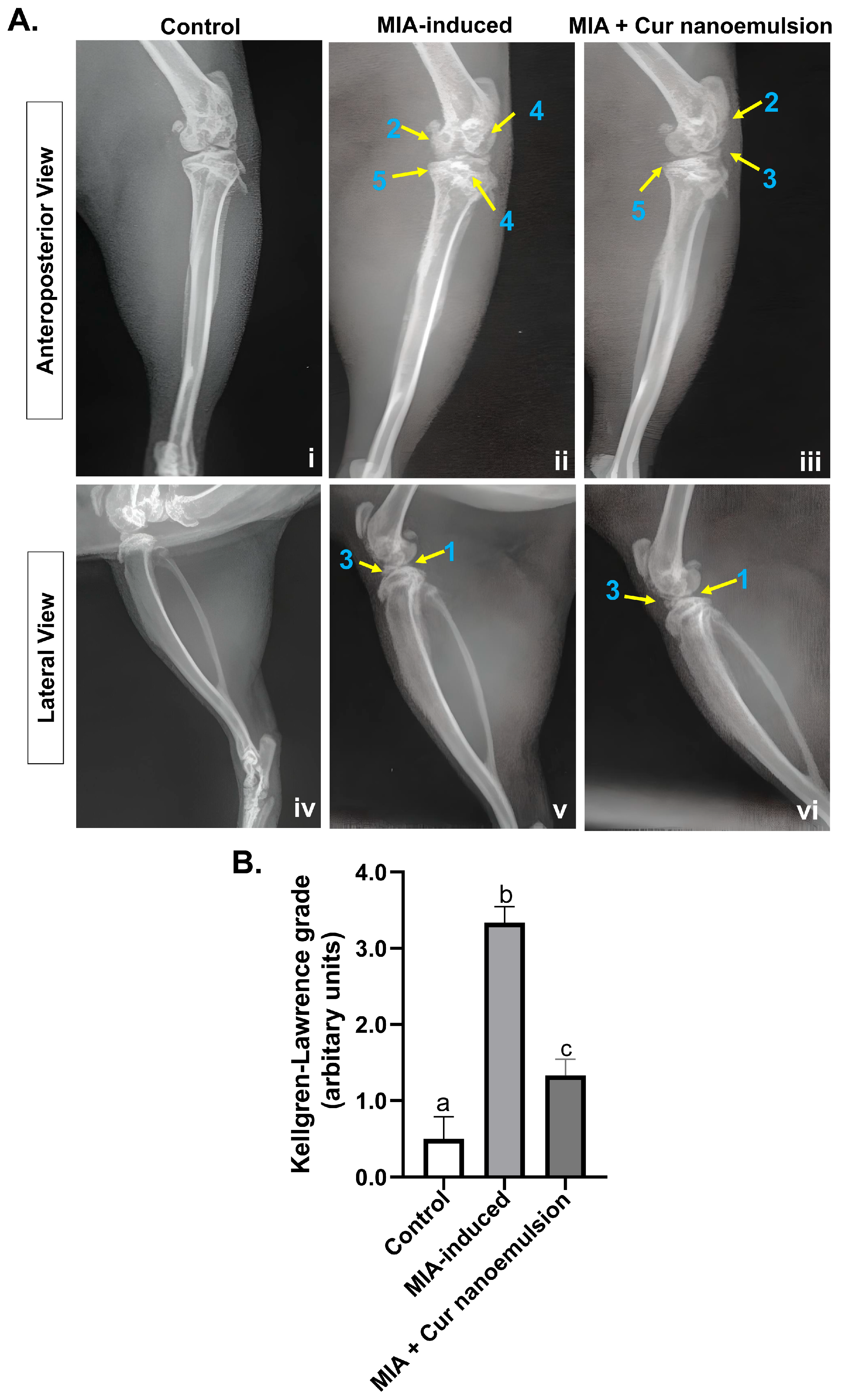 2.1. Curcumin Nanoemulsion Reduced MIA-Induced Knee Joint Edema and Joint Space Narrowing in Osteoarthritic Rats