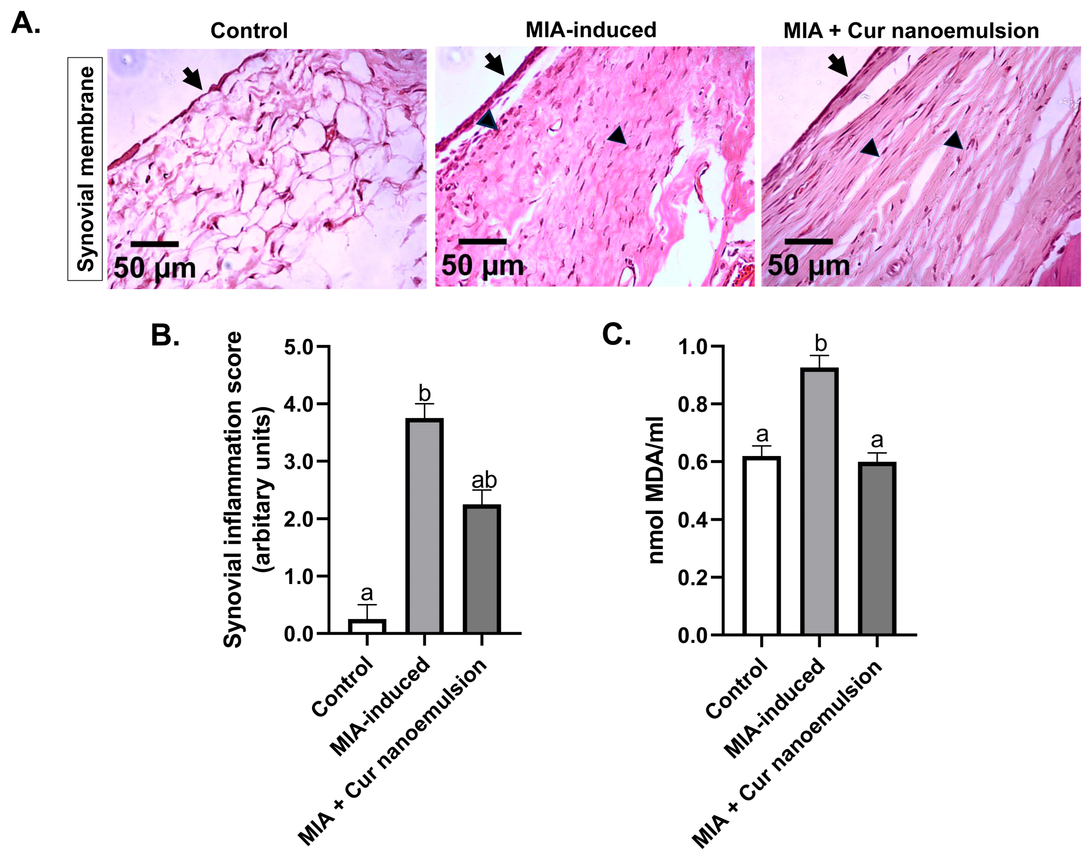 2.2. Curcumin Nanoemulsion Alleviated MIA-Induced Cartilage Fibrillation, Reduced Systemic Oxidative Stress, and Synovial Inflammation in the Knee Joint