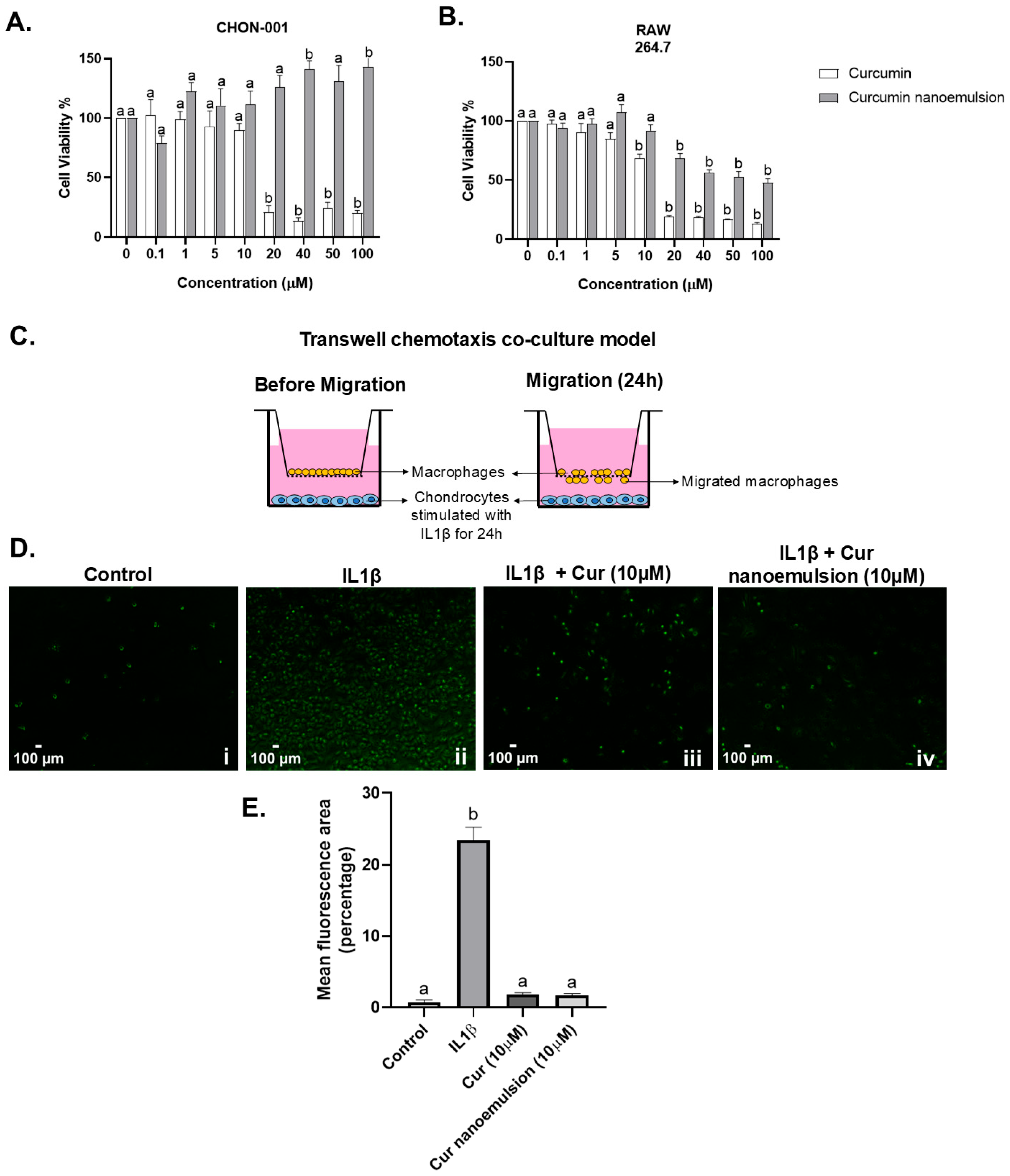 2.3. Curcumin Nanoemulsion Reduced In Vitro Macrophage Migration Towards Chondrocytes in the Presence of IL1β