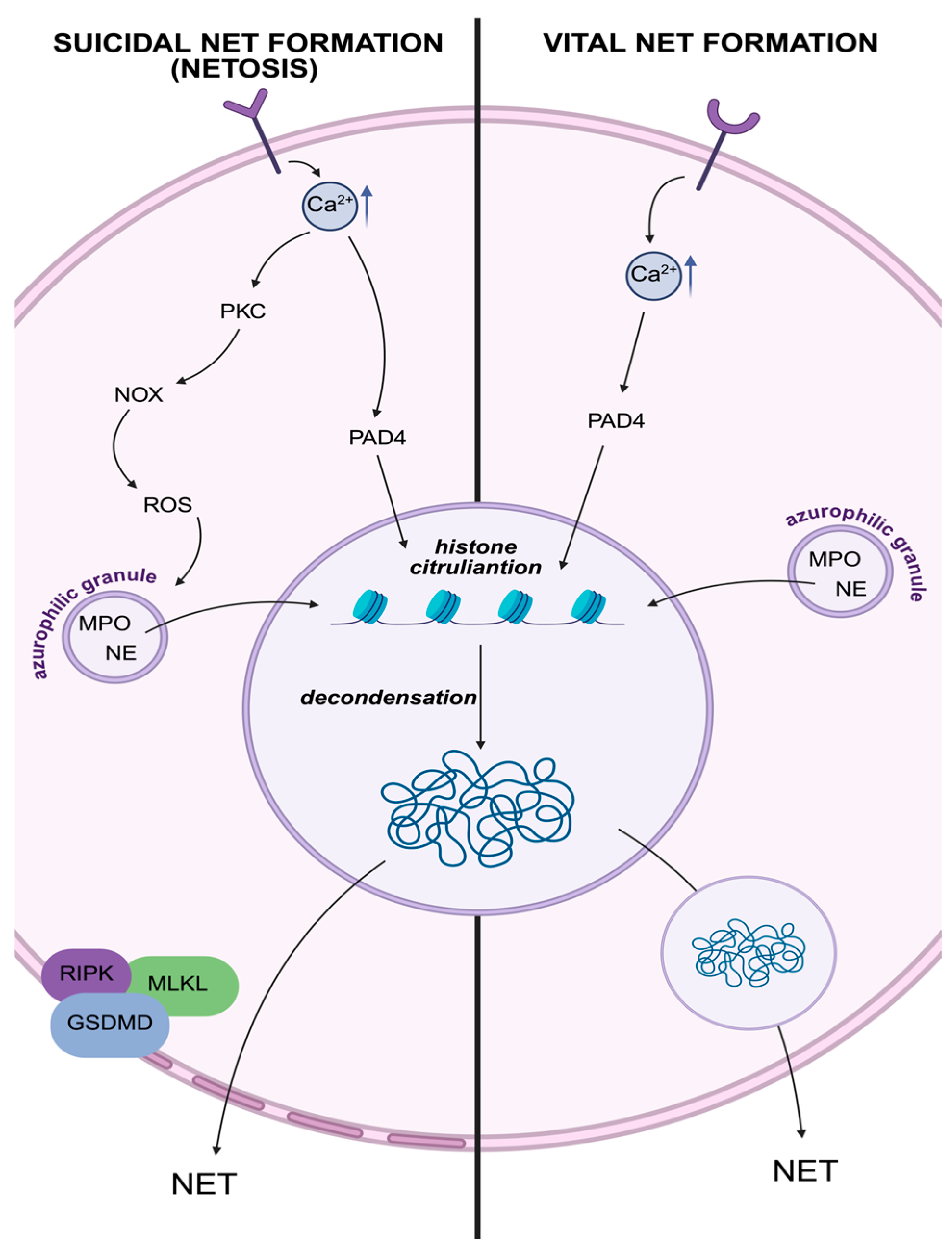 - Chen, T.; Li, Y.; Sun, R.; Hu, H.; Liu, Y.; Herrmann, M.; Zhao, Y.; Muñoz, L.E. Receptor-Mediated NETosis on Neutrophils. Front. Immunol. 2021, 12, 775267. [Google Scholar] [CrossRef]