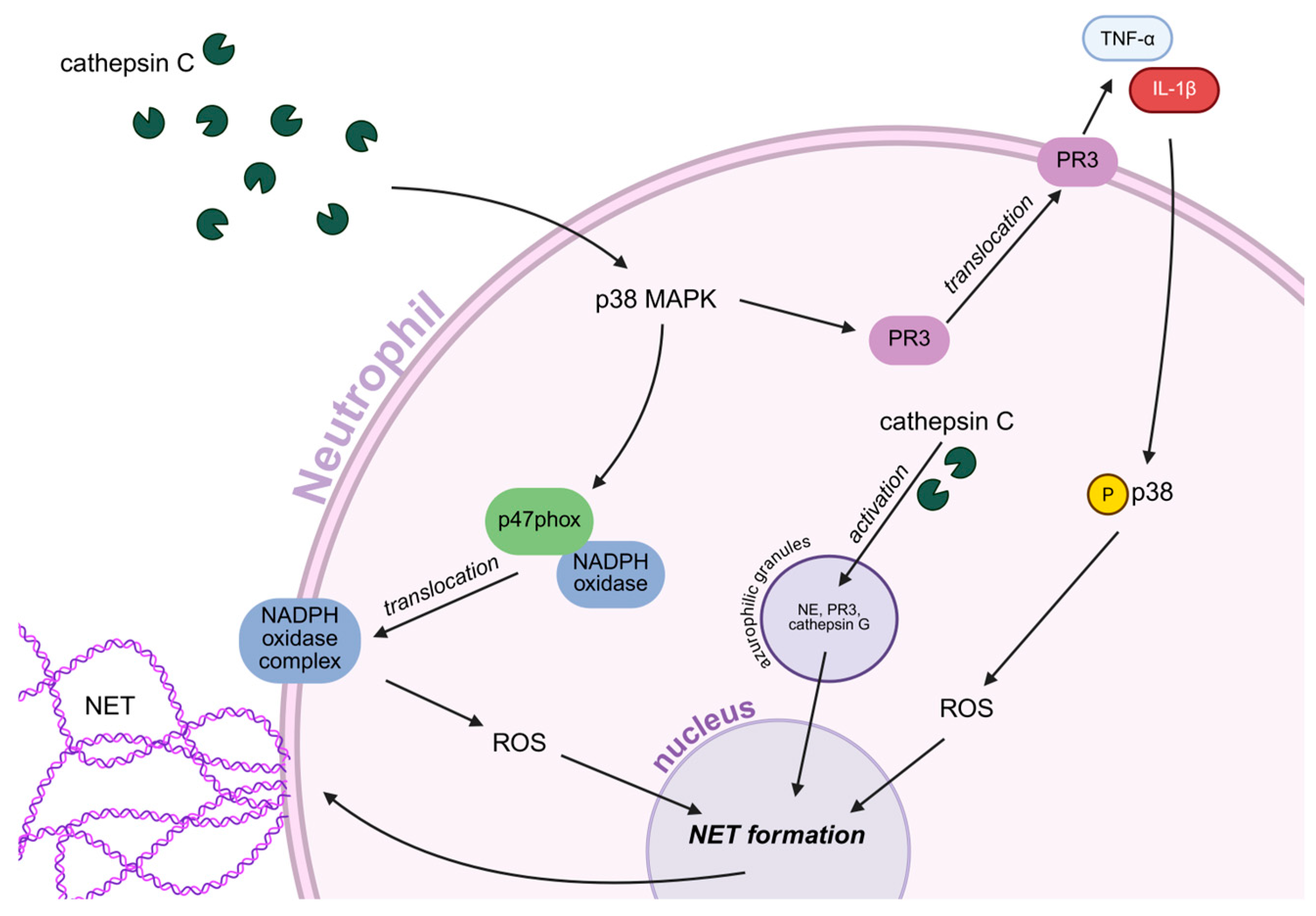 | cathepsin C | is a master activator of neutrophil serine proteases (NE, PR3, cathepsin G); induces NETosis via NOX-dependent ROS and p38 MAPK signaling; activates PR3–IL-1β–NF-κB axis in neutrophils, promoting NET formation; promotes lung metastasis and ischemia–reperfusion injury via IL-1β–p38–ROS pathway; mutations in the gene encoding cathepsin C cause Papillon–Lefèvre syndrome with reduced NET formation | [51,52,53,54] |