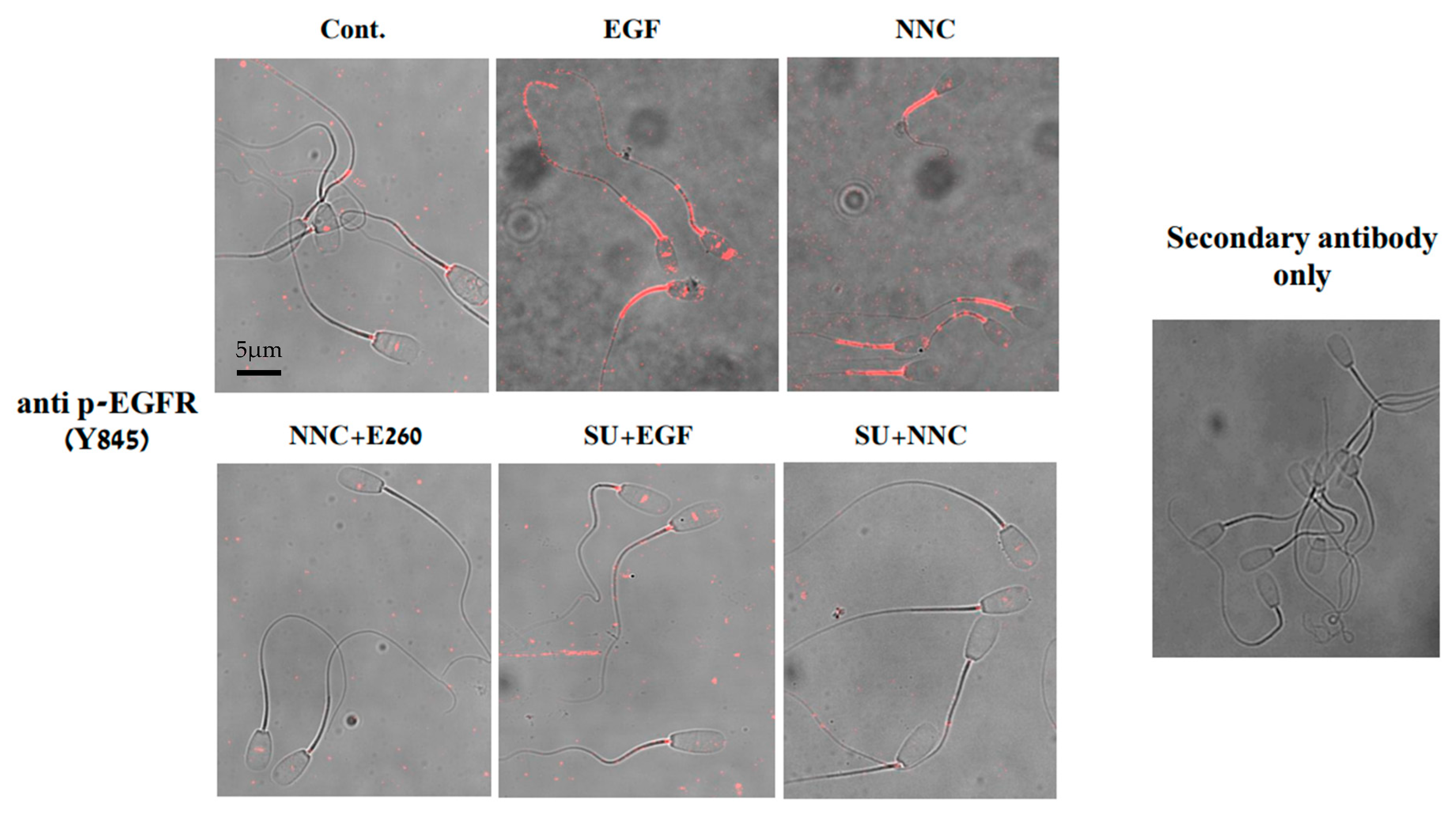 - Etkovitz, N.; Tirosh, Y.; Chazan, R.; Jaldety, Y.; Daniel, L.; Rubinstein, S.; Breitbart, H. Bovine sperm acrosome reaction induced by G-protein-coupled receptor agonists is mediated by epidermal growth factor receptor transactivation. Dev. Biol. 2009, 334, 447–457. [Google Scholar] [CrossRef]