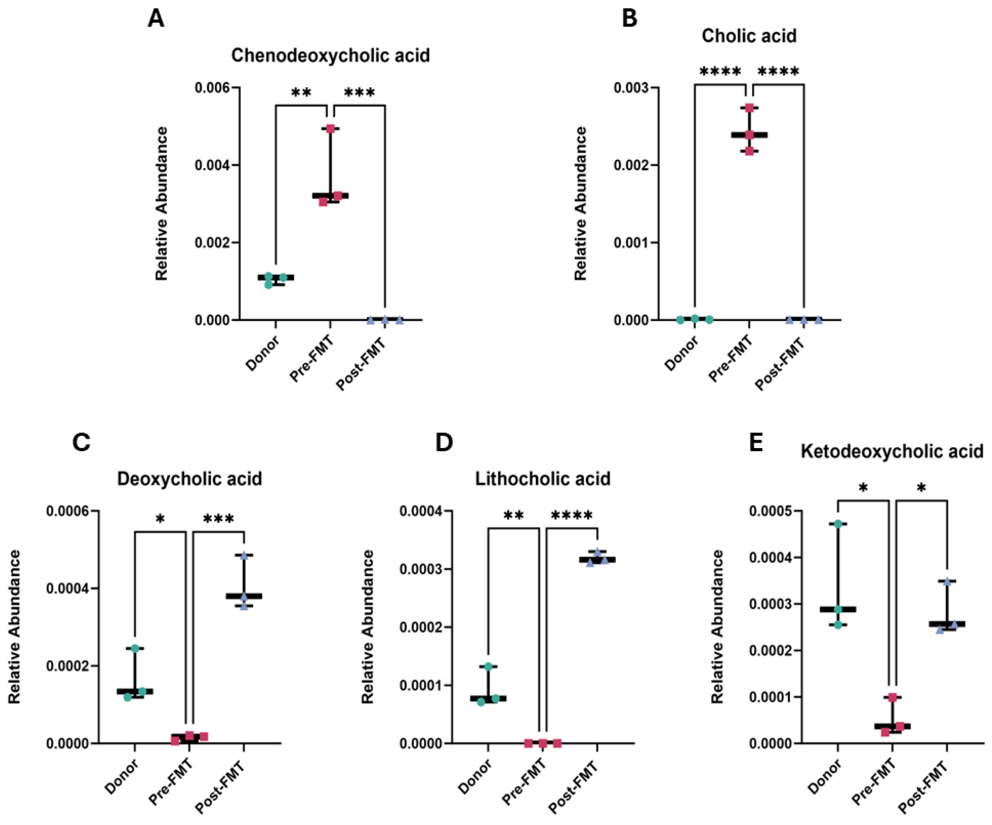 2.2. Elevated Primary Bile Acids and Amino Acids in Pre-FMT Stool Samples