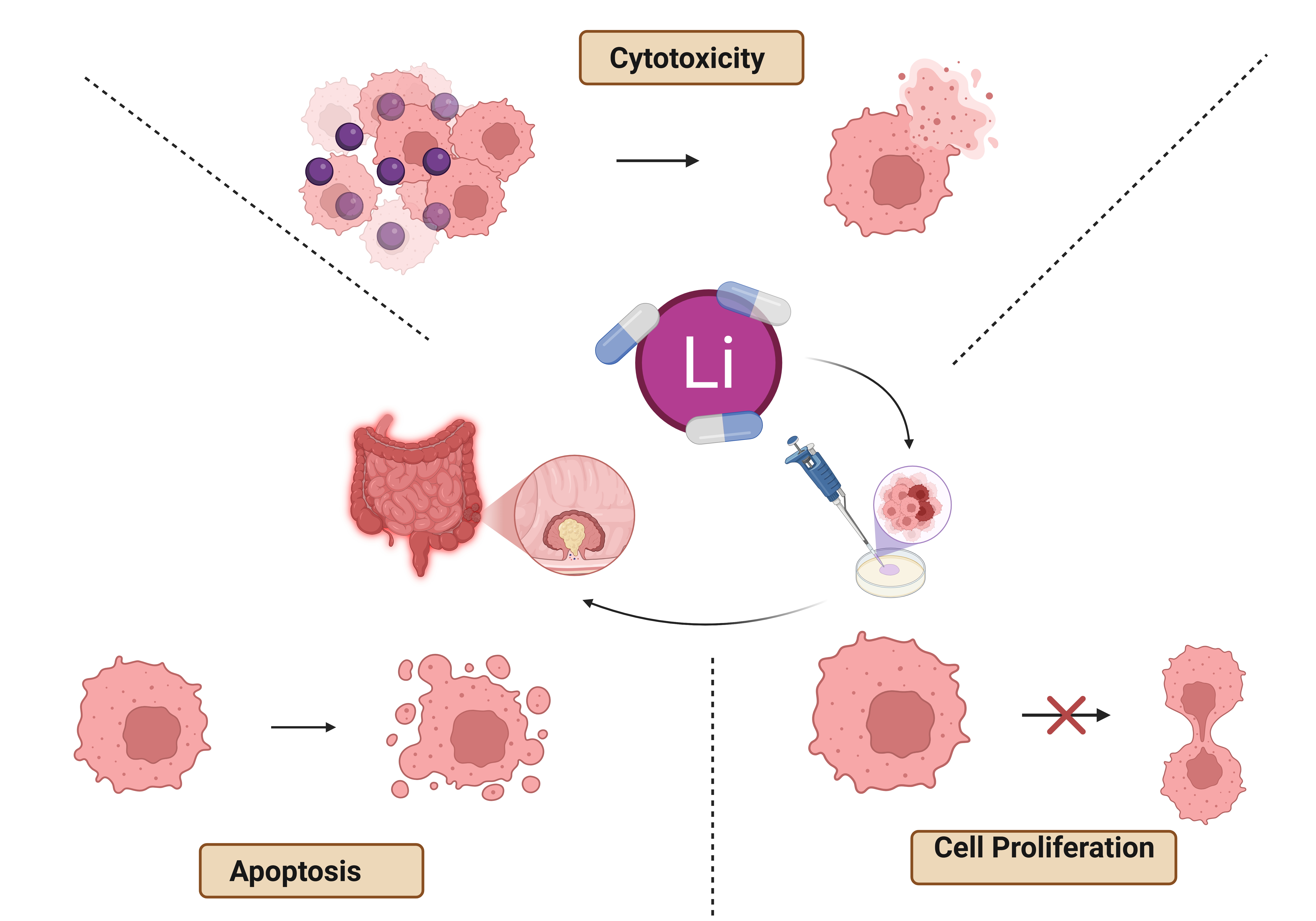 Given the urgent need for more effective and less toxic cancer therapies, this study investigates the therapeutic potential of lithium salts (LiCl and Li2CO3) as anticancer agents in CRC. By examining the cytotoxic, anti-proliferative, and proapoptotic effects of these compounds in CRC cell lines (HCT-116 and SW-620), this study aims to elucidate novel mechanisms of action for these well-characterized compounds. This research provides valuable insights into lithium-induced cell death through a comprehensive analysis of cell viability, membrane integrity, clonogenic potential, apoptotic DNA fragmentation, and the expression of key signaling proteins, including GSK-3β, c-Myc, PARP-1, and pro-caspase-3. The findings could provide new insights into repositioning lithium salts as affordable and accessible therapeutic options, clarify the molecular mechanisms underlying lithium-induced cell death in CRC models, and make them a future therapeutic option in CRC treatment.