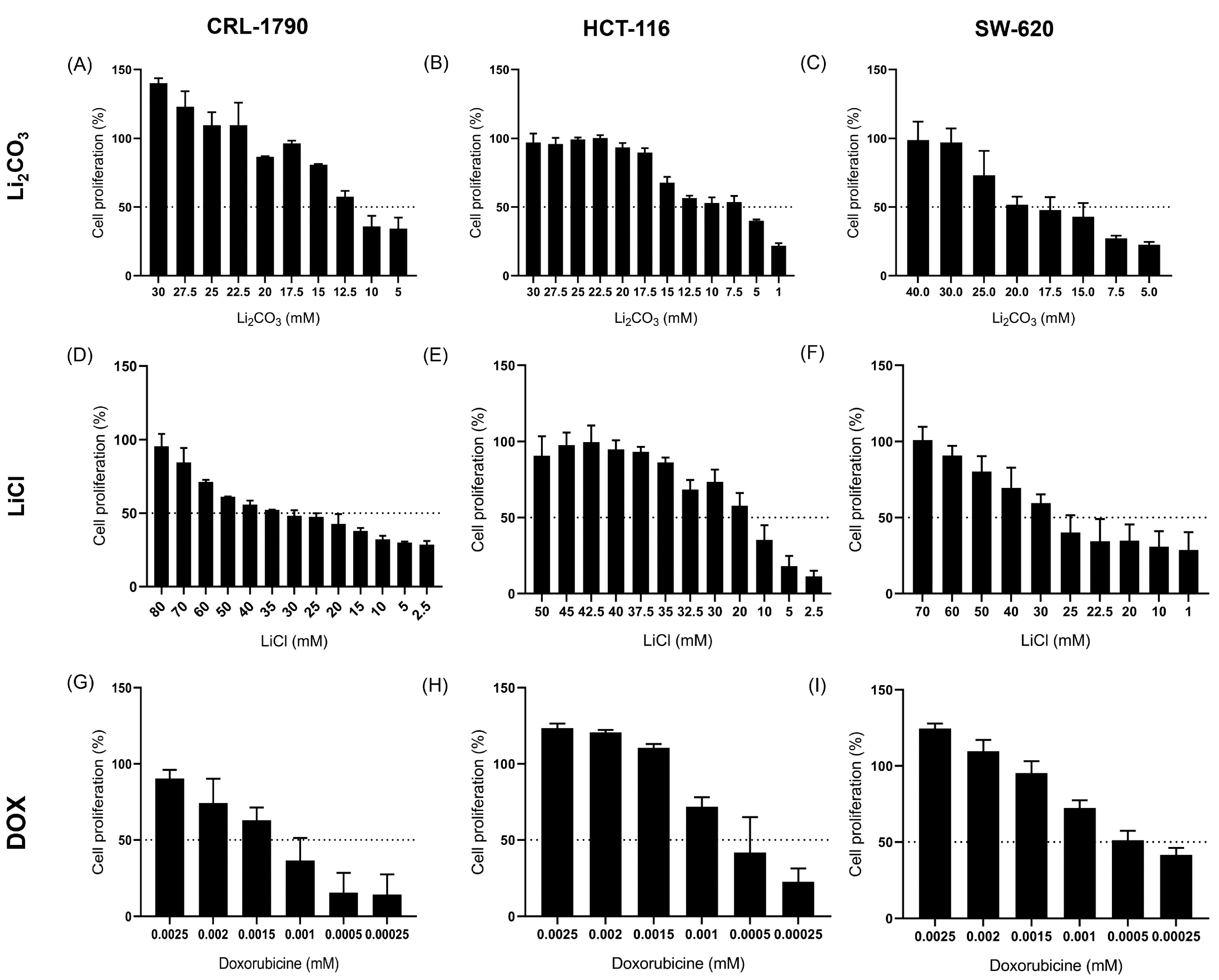 Figure 1. Effect of lithium salts on Cell Proliferation of CCR. Cell lines CRL-1790 (A,D), HCT-116 (B,E), and SW-620 (C,F) were treated with increasing concentrations of Li2CO3, LiCl, and DOX (CRL-1790 (G), HCT-116 (H), and SW-620 (I) cell lines) for 24 h to assess the anti-proliferative effect of lithium salts. In all three cell lines, lithium sales reduced cell proliferation in a dose-dependent manner, indicating that Li2CO3 and LiCl exerted anti-proliferative effects. Data are presented as mean ± standard deviation (S.D.) relative to untreated control cells. All experiments were performed in three independent biological replicates with technical triplicates.