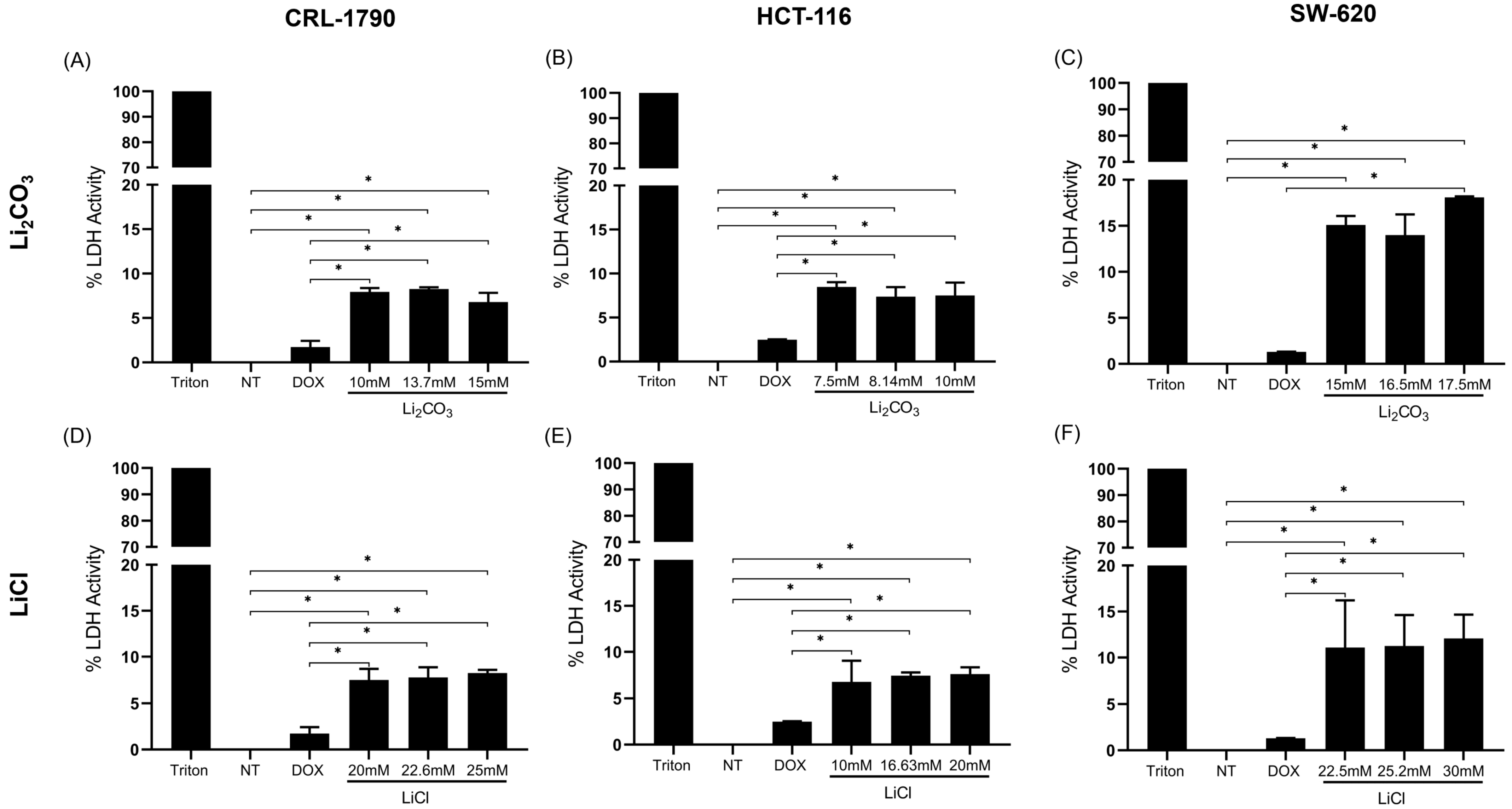 For Li2CO3, the LDH release values were 8.26% ± 0.19%, 7.38% ± 1.07%, and 11.79% ± 4.14% for CRL-1790, HCT-116, and SW-620 cells, respectively. For LiCl, LDH release values were 7.77% ± 1.08%, 7.43% ± 0.33%, and 11.25% ± 3.36% for the same cell lines (Table 2).