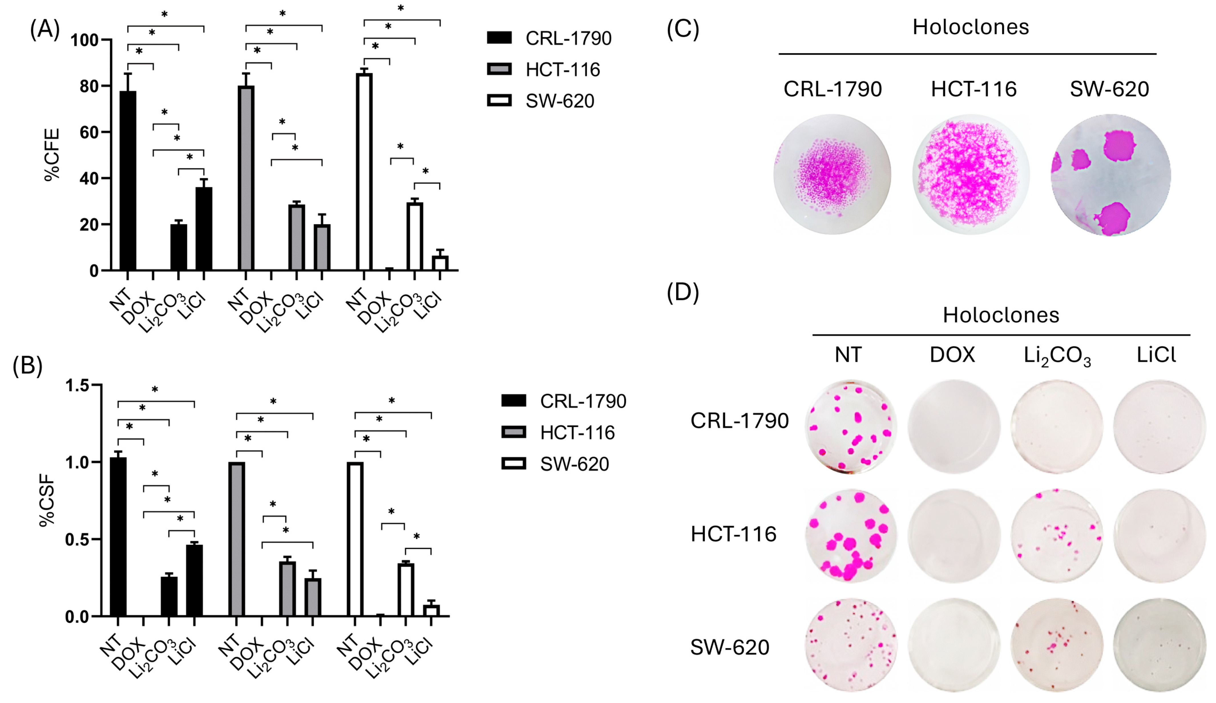 Figure 3. Clonogenic assay results demonstrating decreased survival and increased sensitivity to IC50 concentrations of Li2CO3, LiCl, and doxorubicin in CRL-1790, HCT-116, and SW-620 cell lines. (A) Histogram illustrating the percentage of colony-forming efficiency (CFE) in cells treated with lithium salts, doxorubicin, and non-treated controls at 24 h. * Statistical significance was set at p < 0.05 according to one-way ANOVA followed by Tukey’s multiple comparisons test. (B) Histogram showing the percentage of clonogenic survival fraction (CSF) following 24 h treatment at IC50 concentrations of Li2CO3, LiCl, doxorubicin, and non-treated controls. Bars represent the mean ± standard deviation from three independent biological replicates. * Statistical significance was p < 0.05 according to the one-way ANOVA test and Tukey’s multiple comparisons test. (C) Representative images exposing the morphological features and density of holoclones, following treatment and colony development arrest. (D) Representative photomicrographs of fixed colonies stained with crystal violet, displaying the morphology and density of colorectal cancer cells and colonies after 10 days of culture with or without treatment using lithium salts or doxorubicin.