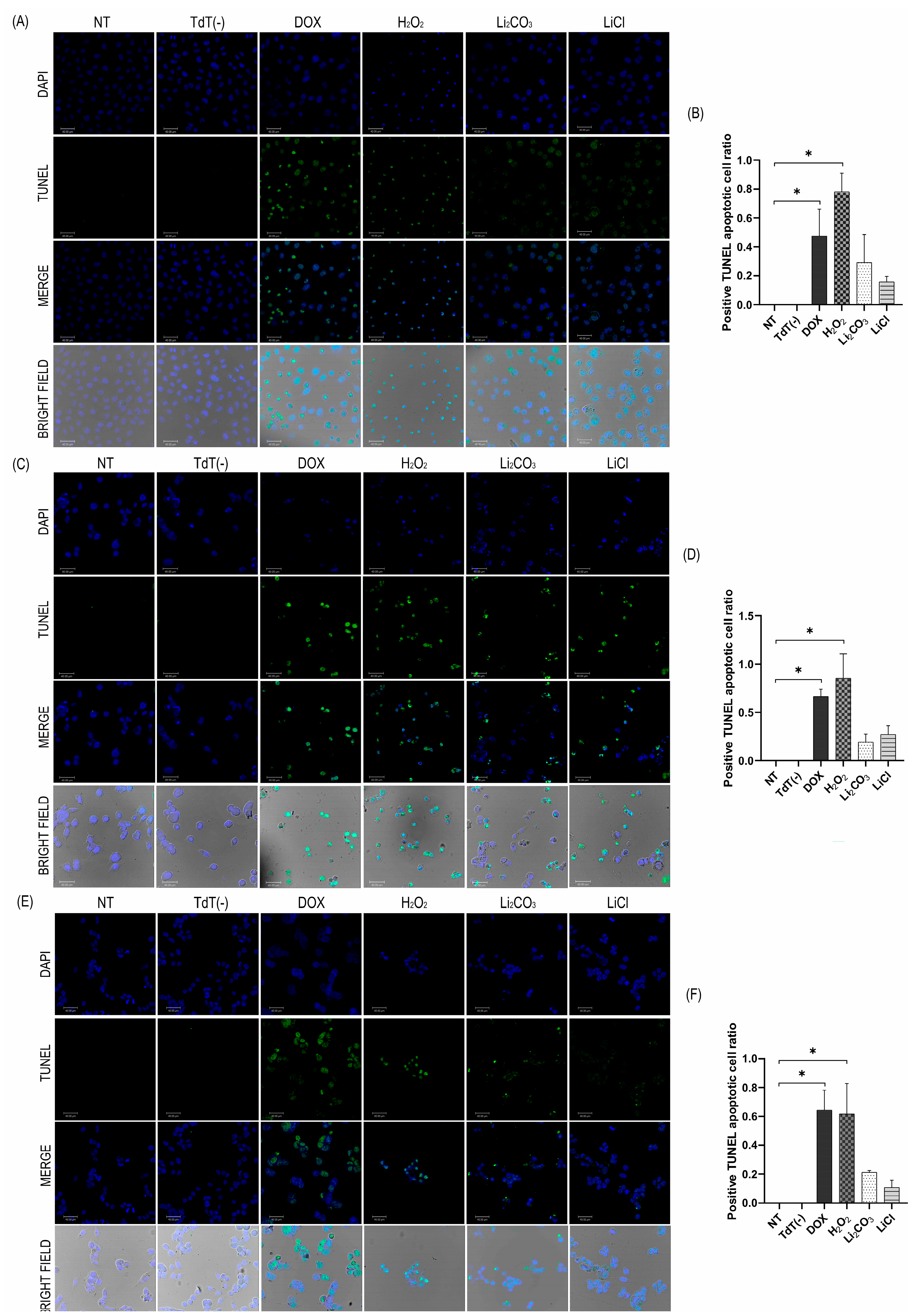 Figure 4. Morphology of DNA fragmentation in cells assessed by fluorescent TUNEL labeling. Panels (A,C,E) (cell lines CRL-1790, HCT-116, and SW-620, respectively), display TUNEL, DAPI, merged, and bright-field images, representing the number of apoptotic cells, determined by the TUNEL assay. A higher number of apoptotic cells was observed in the presence of Li2CO3 in the SW620 cell line (E), while treatment with LiCl induced a greater apoptotic response mainly in the HCT-116 cell line (C). Panels (B,D,F) shows the apoptotic cell ratio, in correspondence with their respective composite image (panels A,C,E). The images were obtained using a LEICA confocal microscope with a magnification of 40×. Cells were treated for 24 h under the following conditions: NT, without TdT enzyme (TdT(−)), DOX, H2O2, Li2CO3, and LiCl. Each image represents results from three independent experiments. * p < 0.05 according to one-way ANOVA followed by Tukey’s multiple comparisons test.