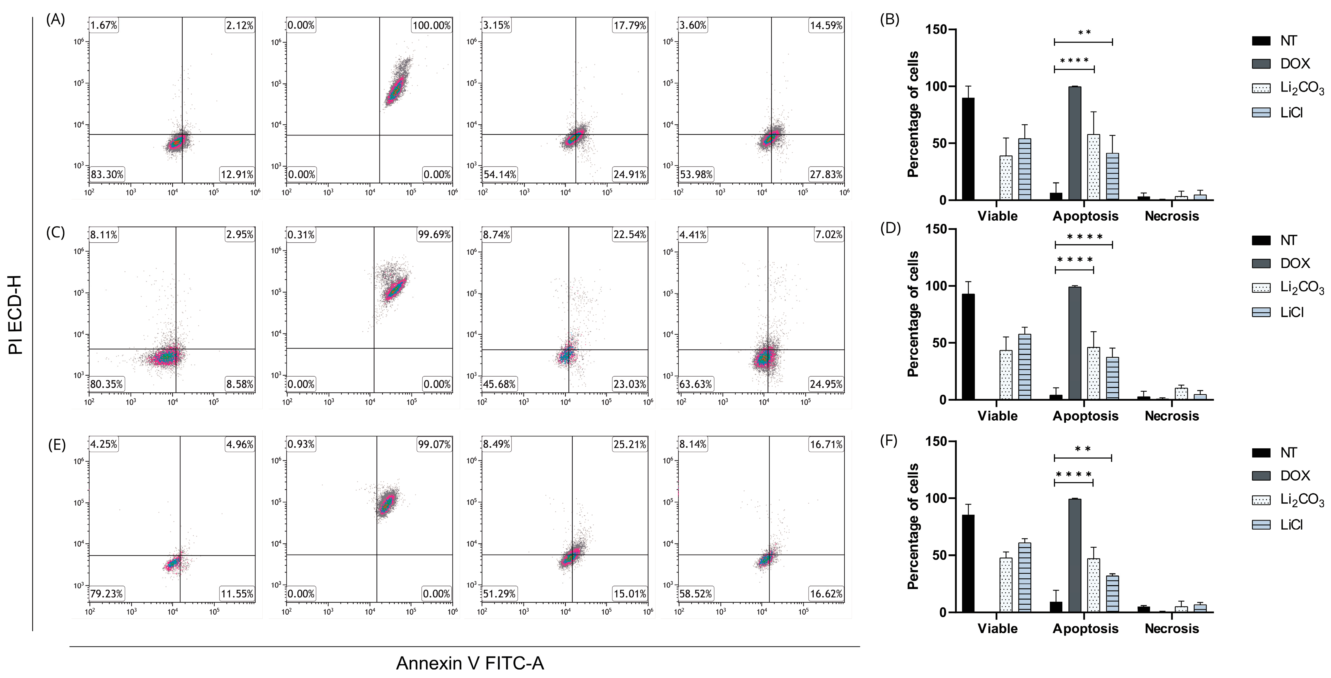 Figure 5. Analysis of apoptosis and necrosis by flow cytometry using Annexin V-FITC/PI dual staining in three human cancer cell lines treated with lithium salts. (A,B) CRL-1790 cells; (C,D) HCT-116 cells; (E,F) SW620 cells. Dot plots illustrate the distribution of viable cells (lower left quadrant: Annexin V/PI), early apoptotic cells (lower right quadrant: Annexin V+/PI), late apoptotic cells (upper right quadrant: Annexin V+/PI+), and necrotic cells (upper left quadrant: Annexin V/PI+). Cells were treated with Li2CO3, LiCl, or doxorubicin (DOX, positive control), or left non-treated (NT). Lithium salt treatments induced a significant increase in apoptotic populations with minimal necrotic response across all cell lines, while DOX induced nearly complete late apoptosis. Data are representative of three independent experiments and the values are expressed as the mean ± SD with ** p < 0.0019, and **** p < 0.0001.