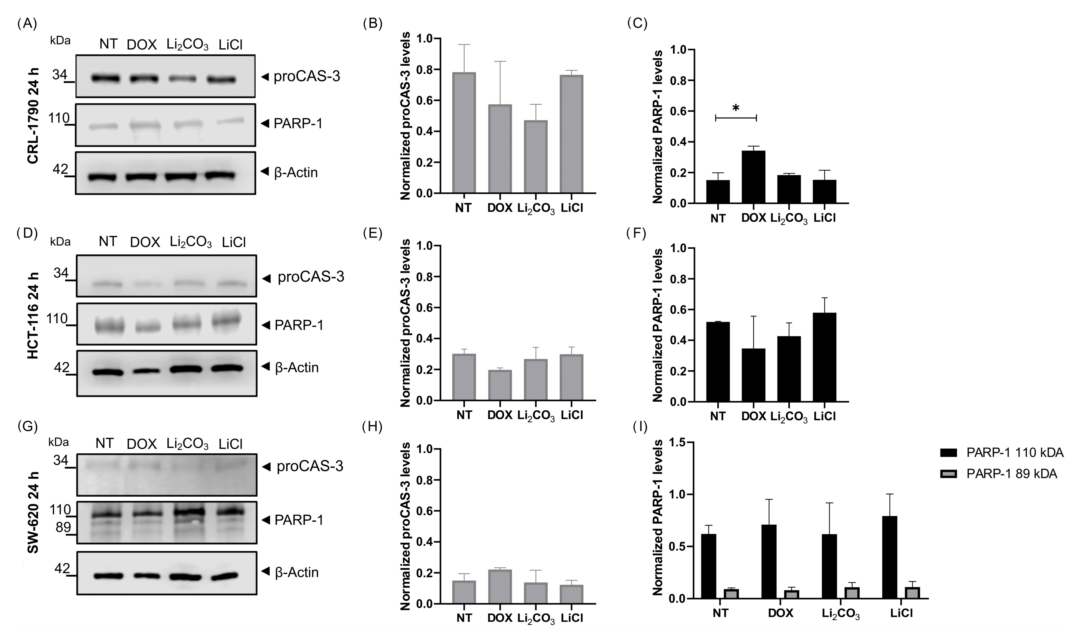 Figure 6. Effect of lithium salts on the expression of apoptotic biomarker proteins after 24 h of treatment. Western Blot analysis of pro-caspase-3 (proCAS-3) and poly(ADP-ribose) polymerase-1 (PARP-1) expression in CRL-1790 (Panels (AC)), HCT-116 (Panels (DF)), and SW-620 (Panels (GI)) cells treated for 24 h with Li2CO3 or LiCl, compared with NT controls. Full-length proCASP-3 was detected in all cell lines and treatment conditions with no significant changes in expression levels. PARP-1 expression was observed across all groups, showing cell line-specific differences: SW-620 cells exhibited both full-length PARP-1 (110 kDa) and the cleaved fragment (89 kDa), whereas CRL-1790 and HCT116 cells did not display the cleaved form under any treatment condition. β-actin was used as the internal loading control. Data are representative of three independent experiments, and values are expressed as mean ± SD. * p < 0.02 according to one-way ANOVA followed by Tukey’s multiple comparisons test.